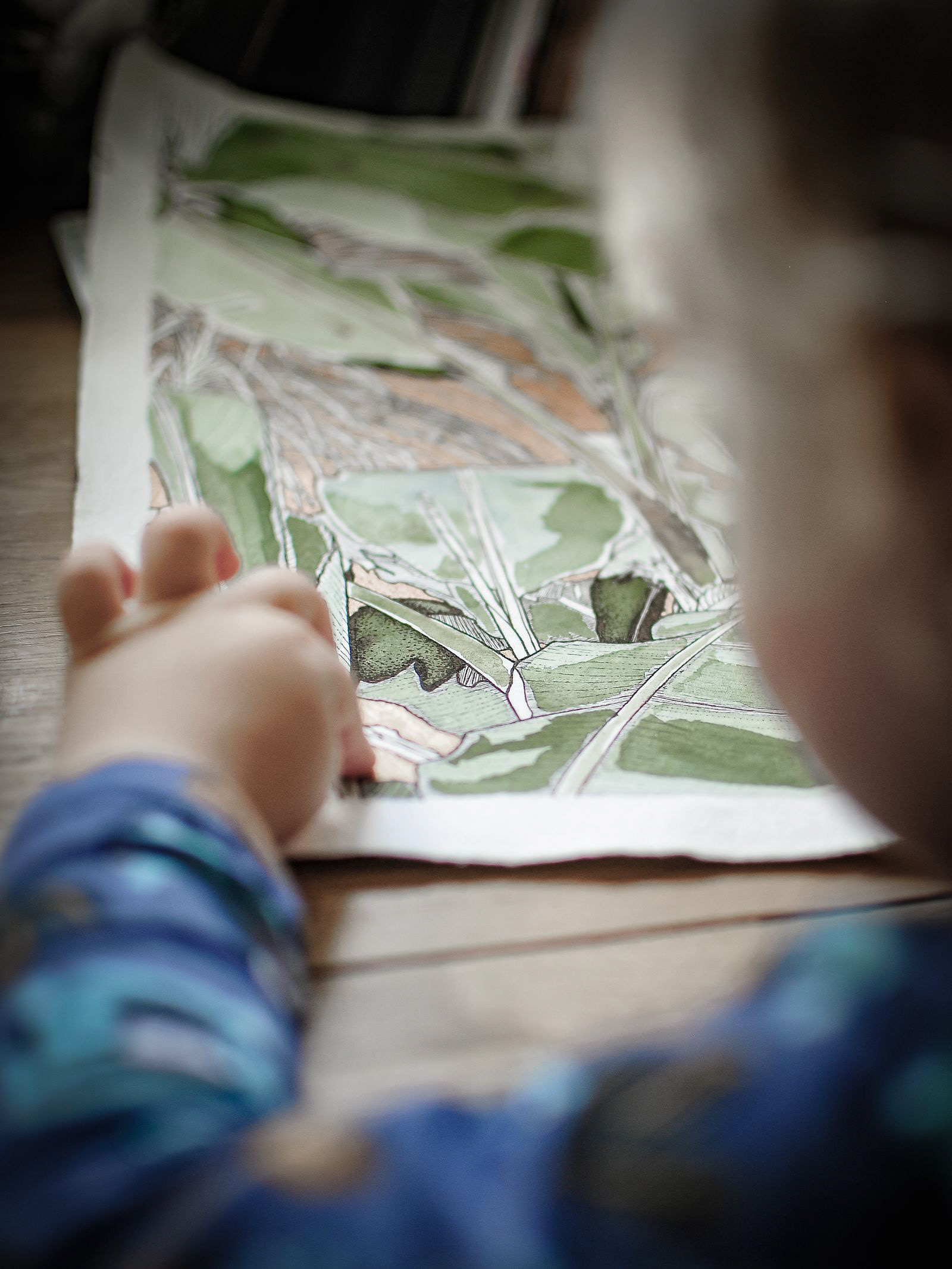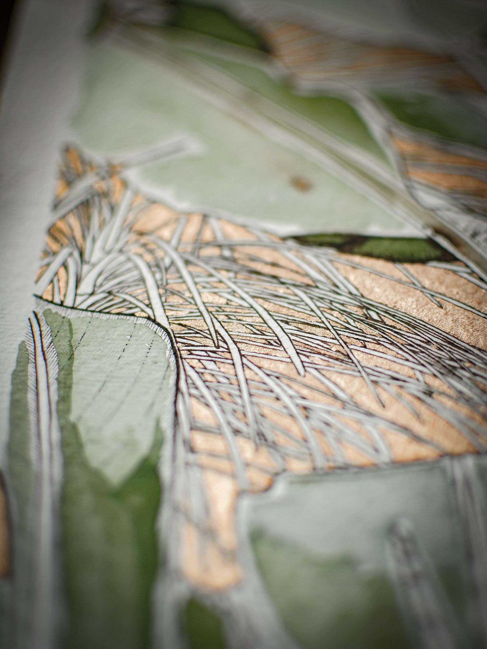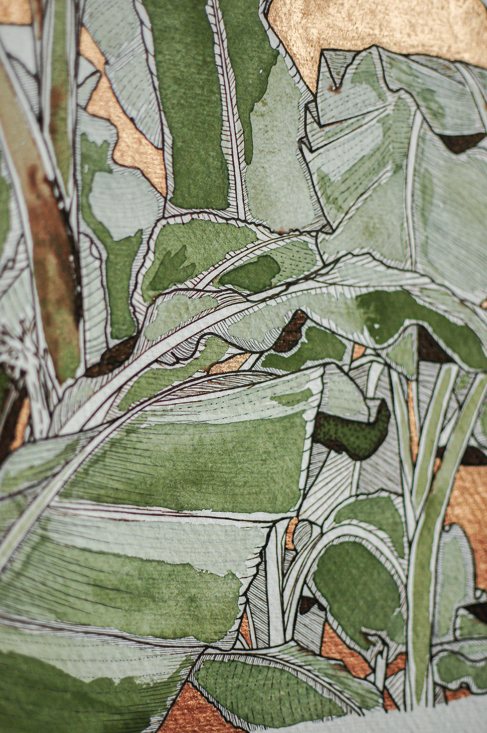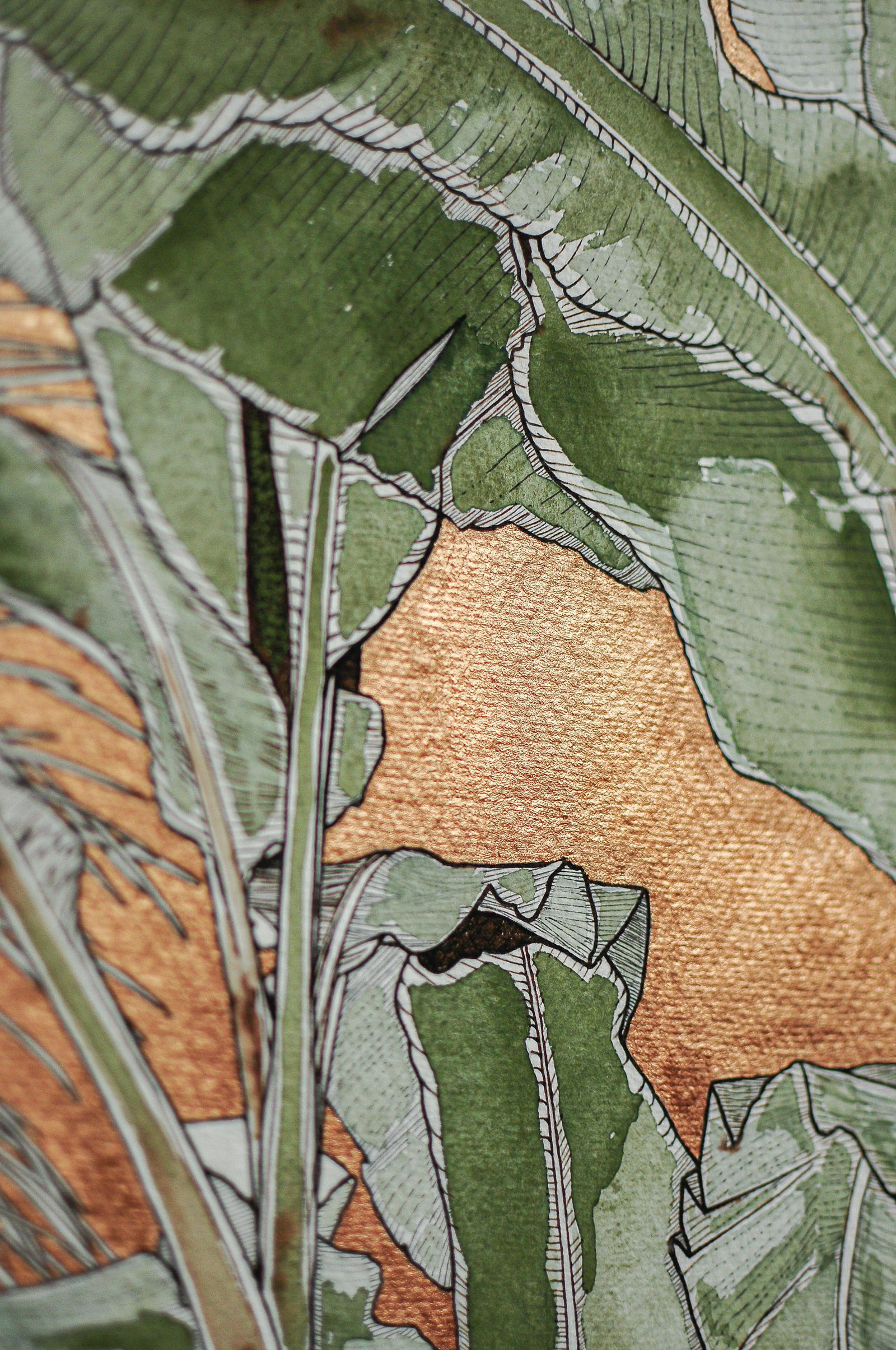 This is an original painting "Bananas Trees" made in mixed media technics: ink, liquid metal and watercolours on handmade paper 300 gsm.