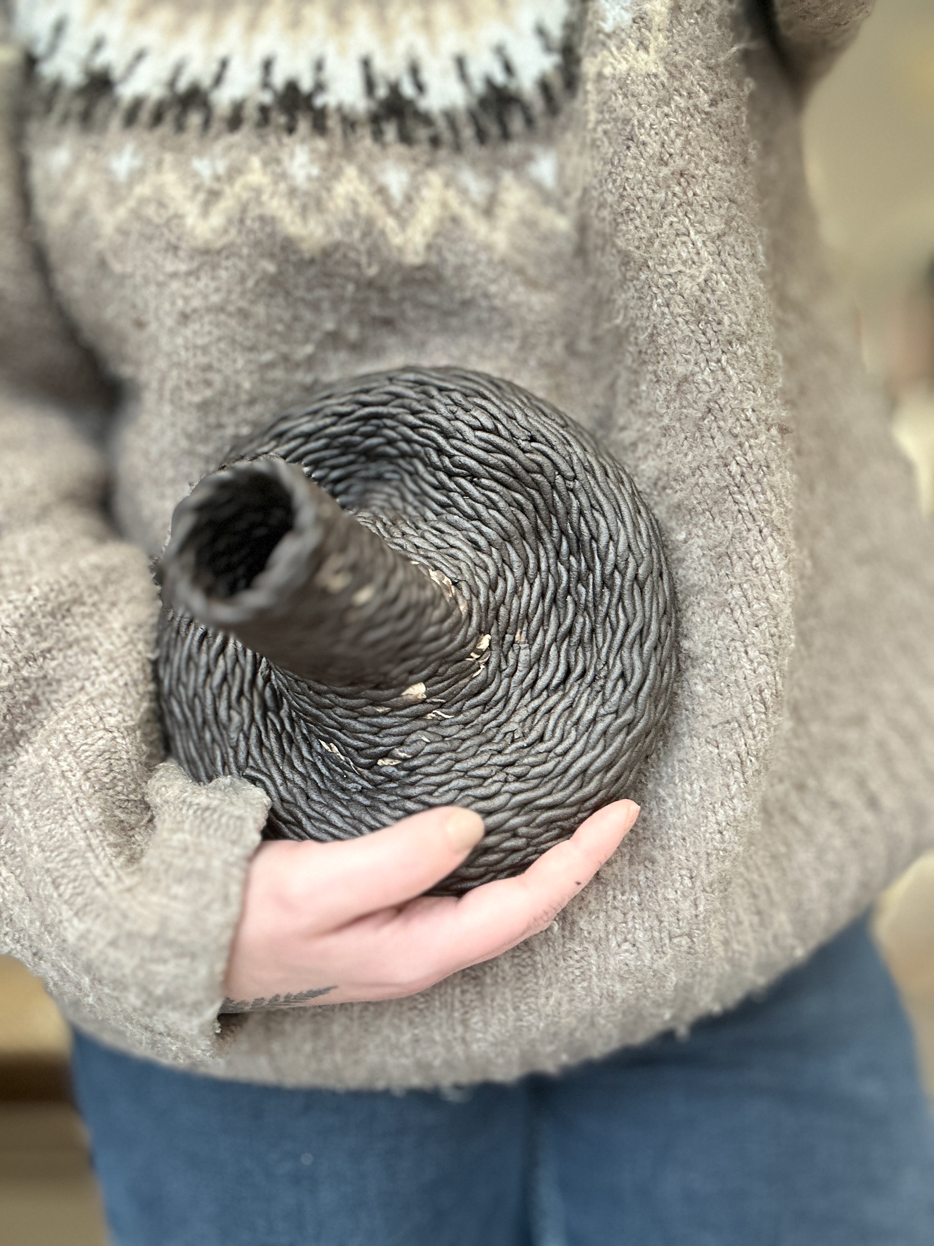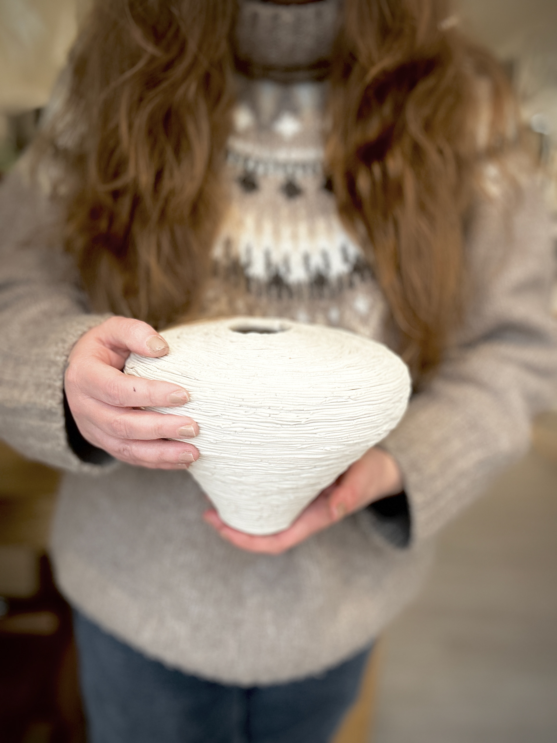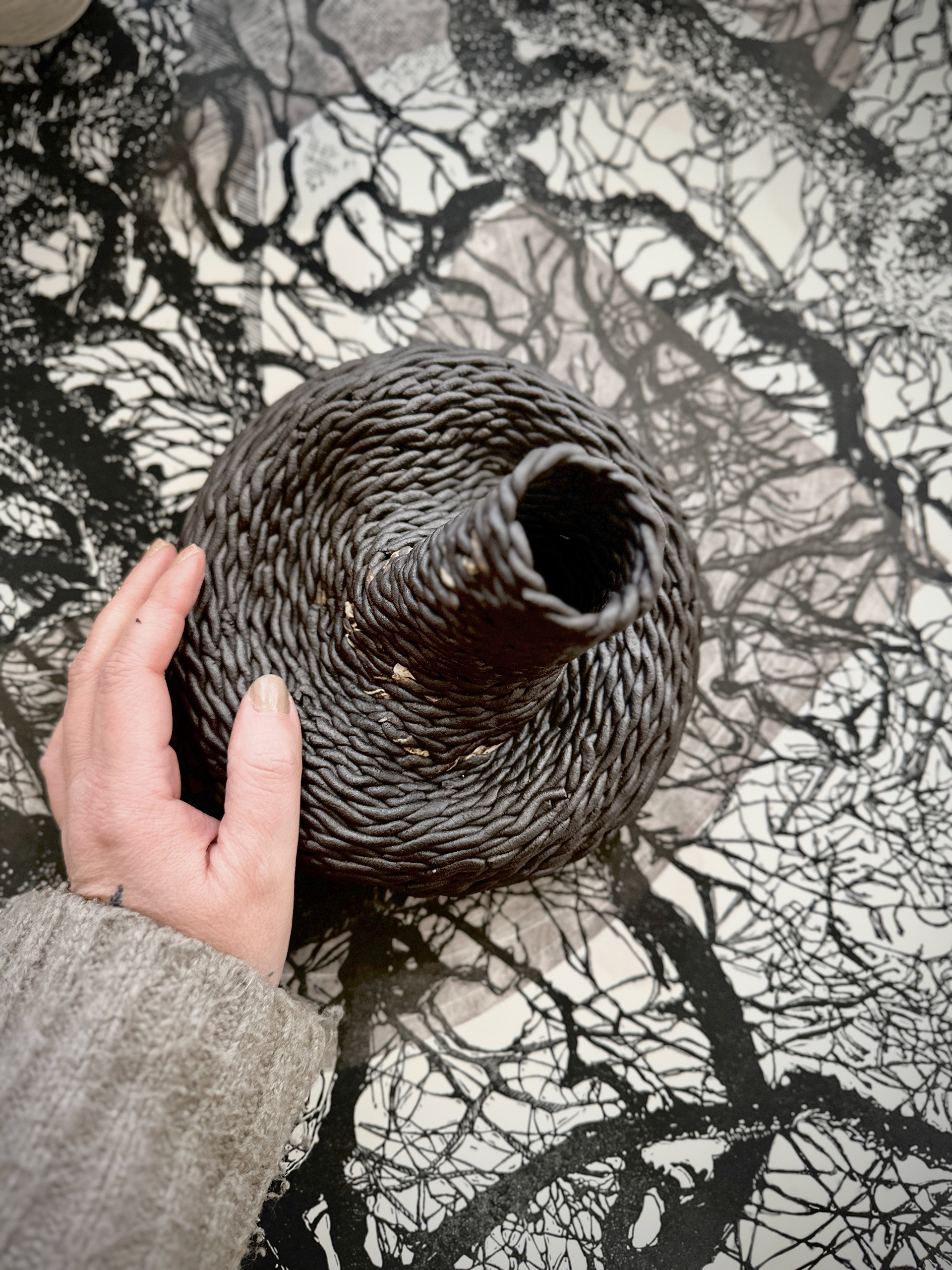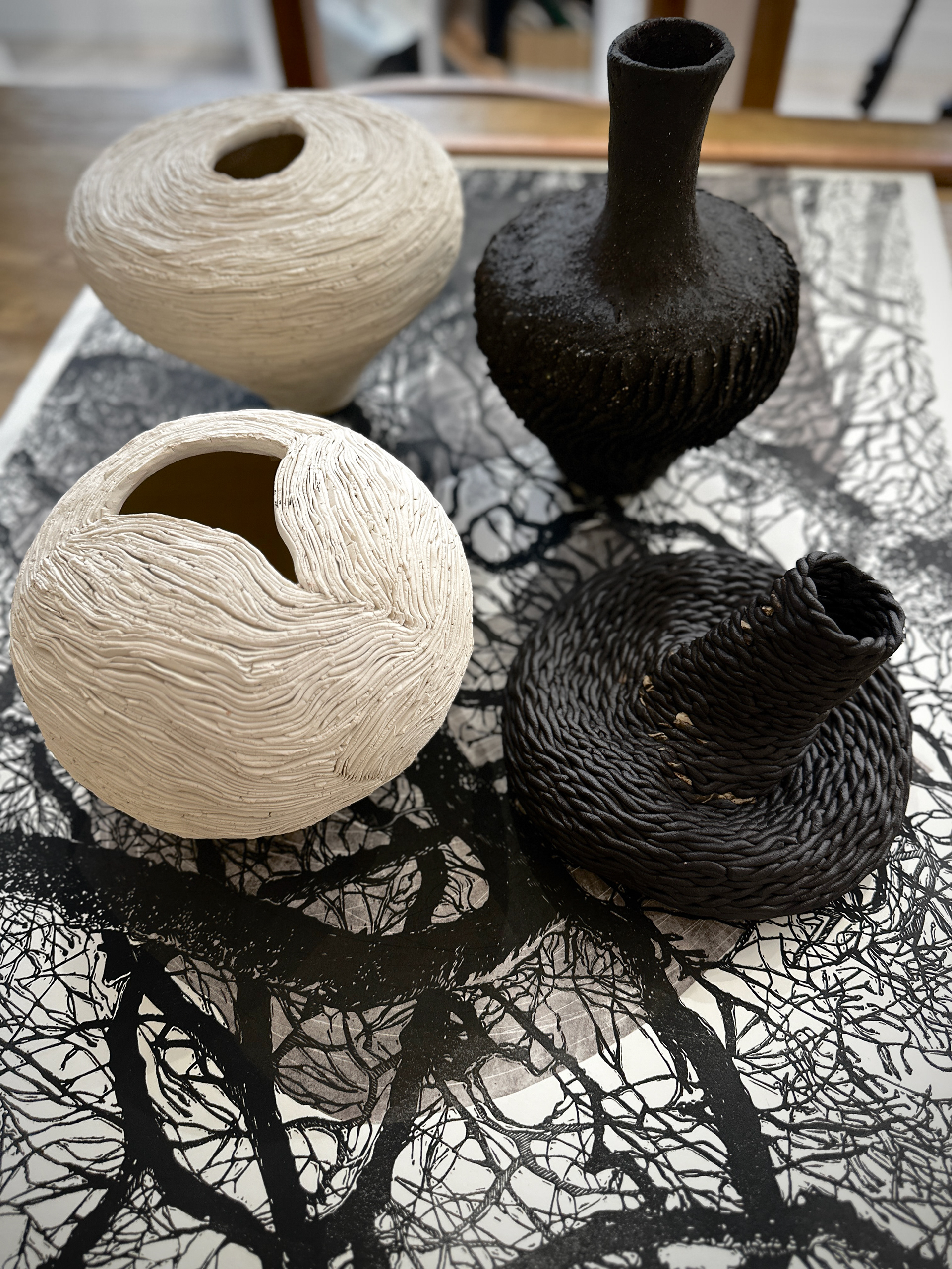 Each vessel is approximately 14x14x20 cm, making them functional yet sculptural in their presentation. The organic forms and surface treatments blur the line between utility and art, making them striking both as standalone pieces and as part of this collection. The careful attention to texture and the interplay of light and shadow on the surfaces demonstrate a printmaker’s sensitivity to detail translated into a three-dimensional medium.