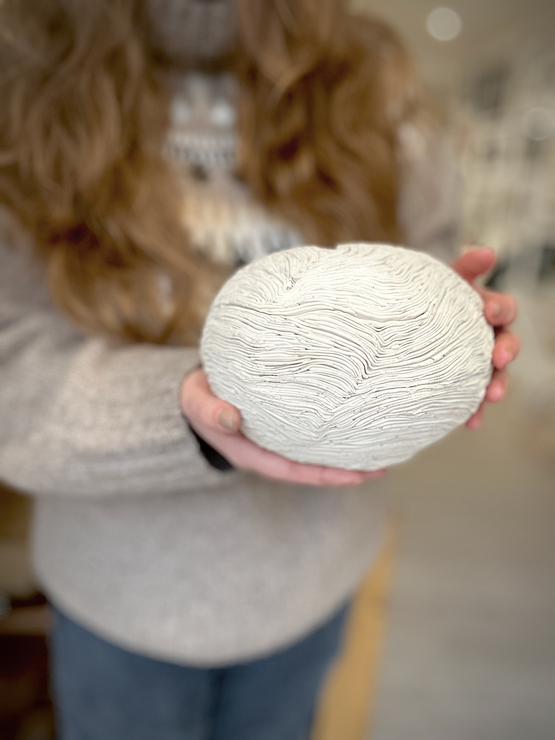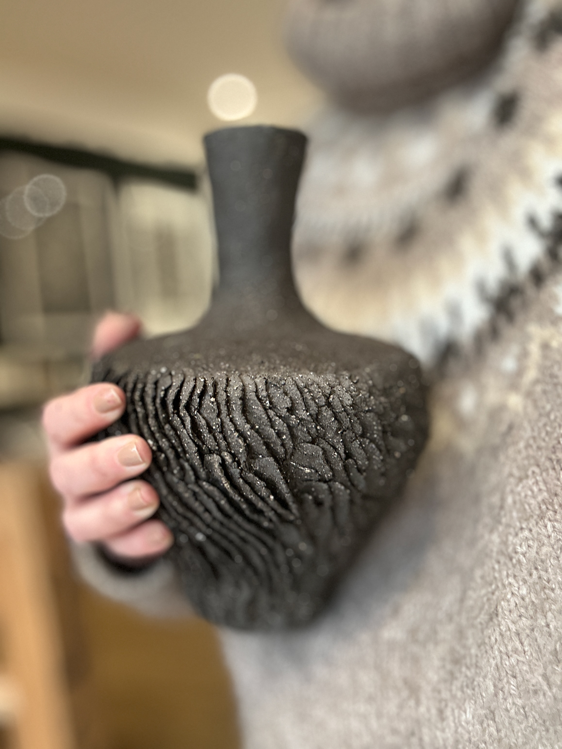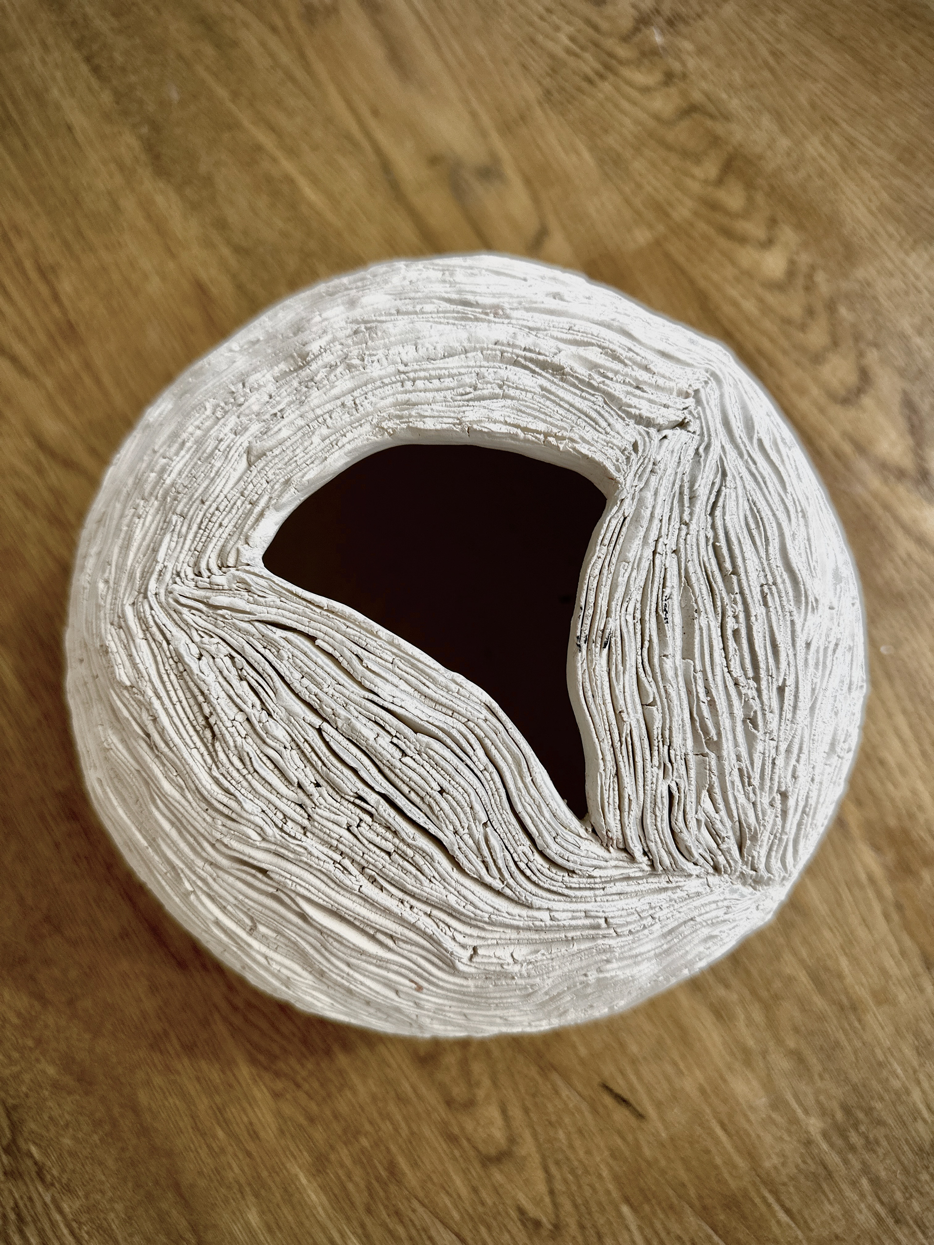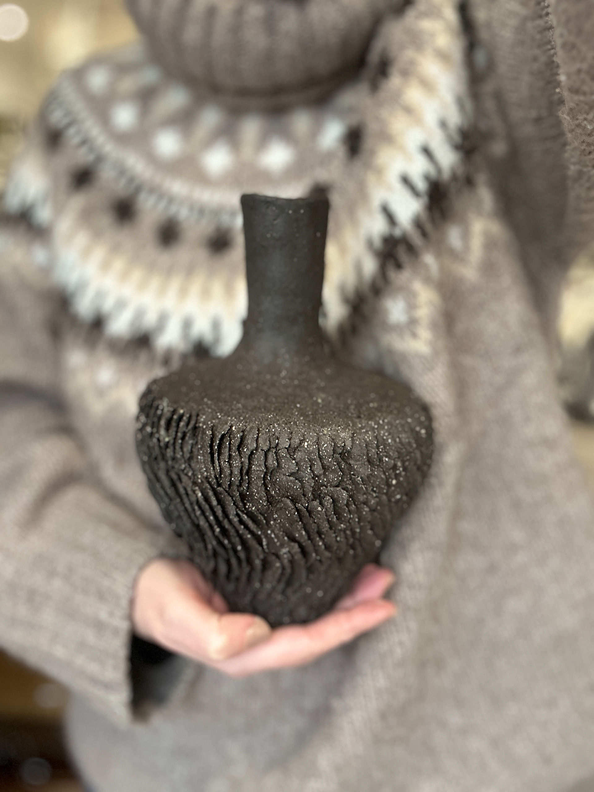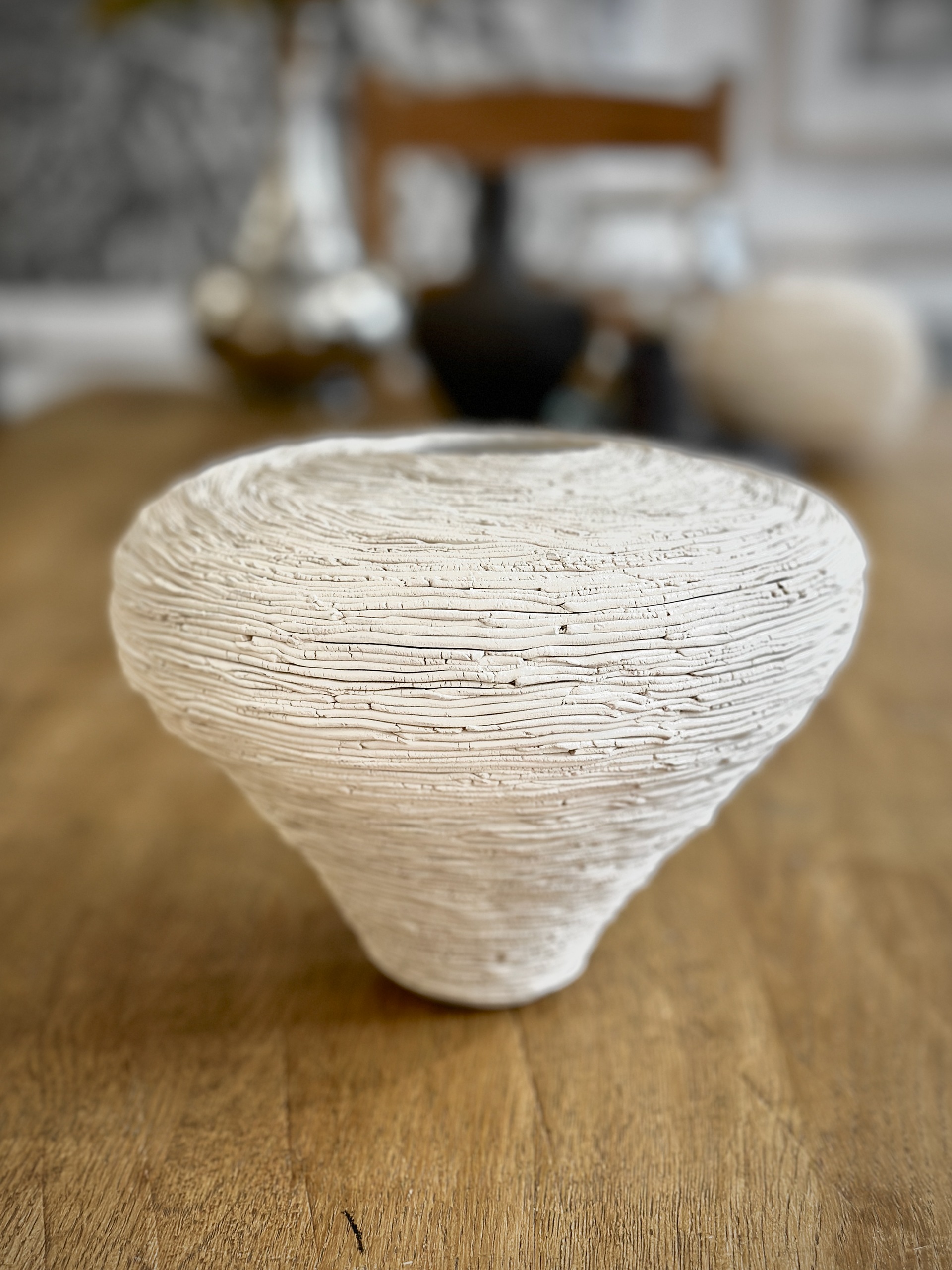 各器のサイズはおおよそ14×14×20cmで、機能性を持ちながらも彫刻的な存在感があります。有機的な形状と表面処理は、実用性と芸術性の境界を曖昧にし、このコレクションの一部としても単独の作品としても際立っています。質感への細やかな配慮と、表面における光と影の相互作用は、版画家としての繊細な感性が三次元の媒体に翻訳されたことを示しています。