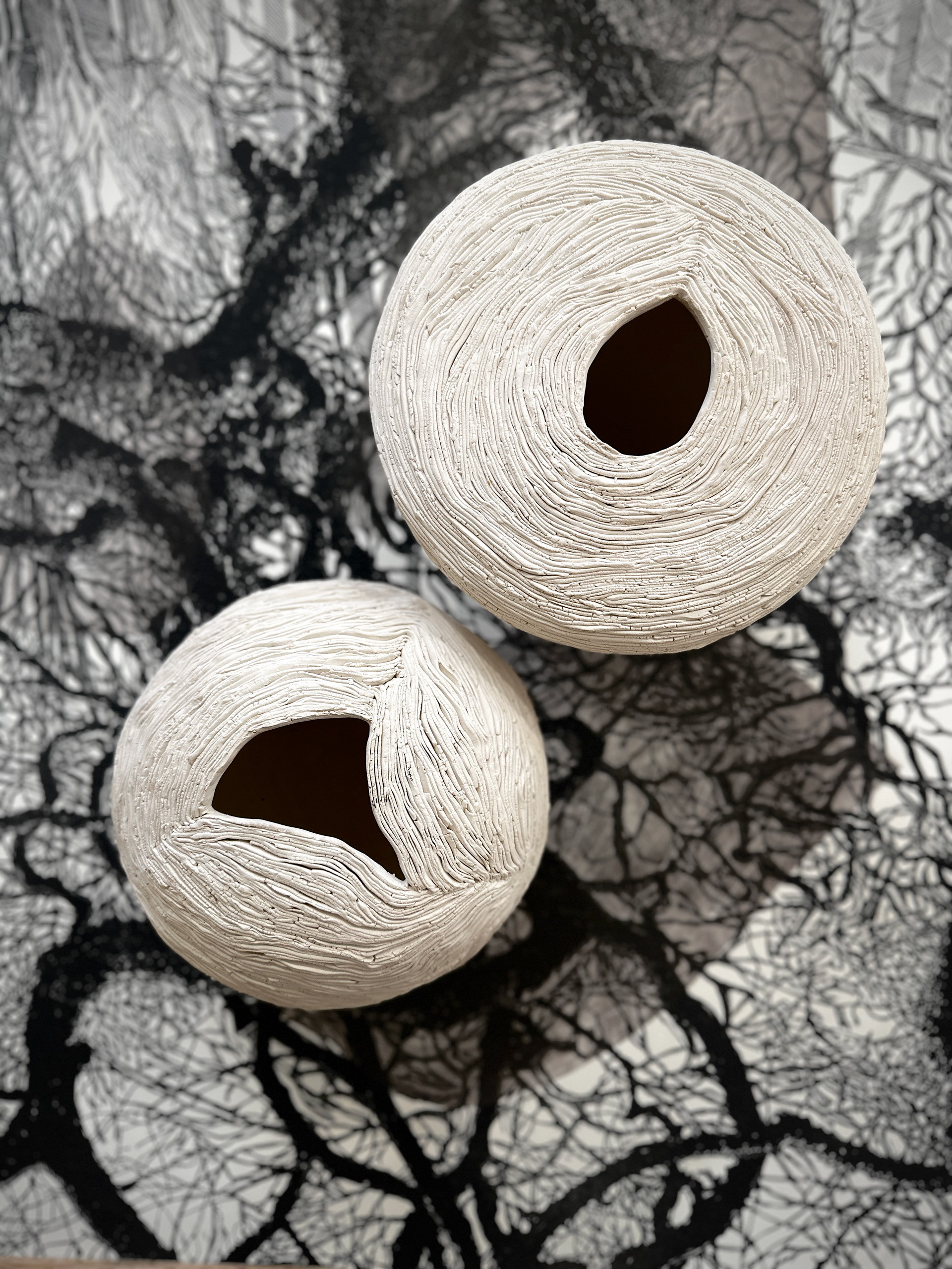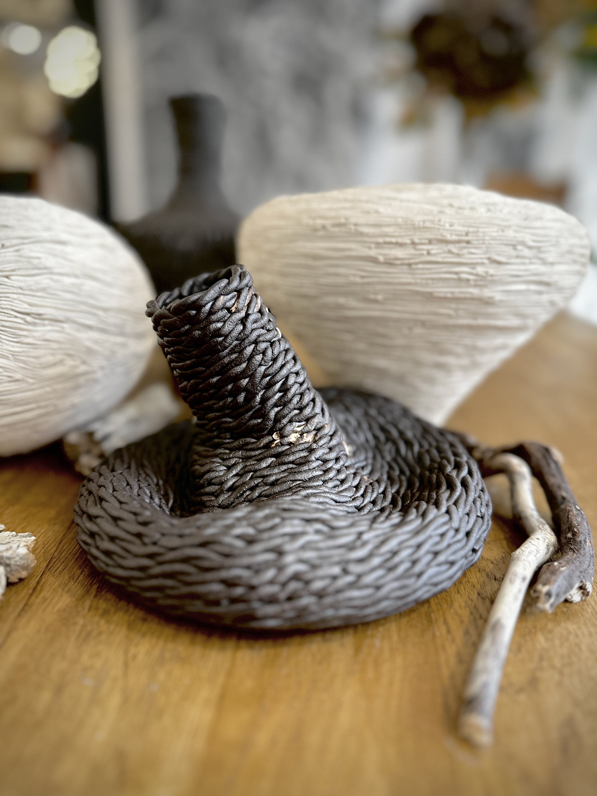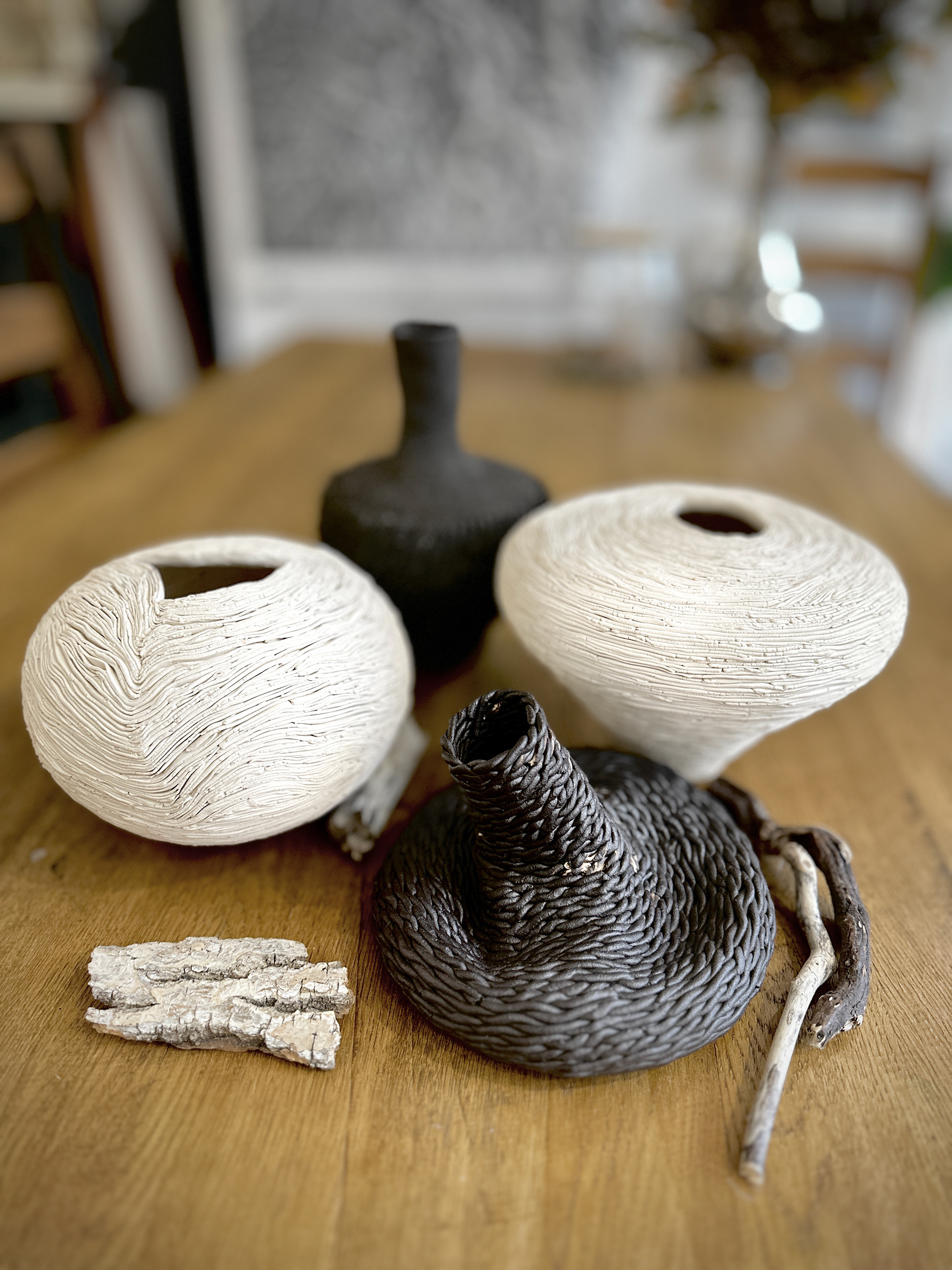 The white and black vessels contrast sharply in color, adding visual interest while maintaining a balanced harmony. Their textured finishes are reminiscent of Aga Kubish’s background as a printmaker, suggesting an exploration of texture and detail that is central to her work. The inclusion of driftwood or bark-like objects complements the ceramic forms, reinforcing the natural theme.