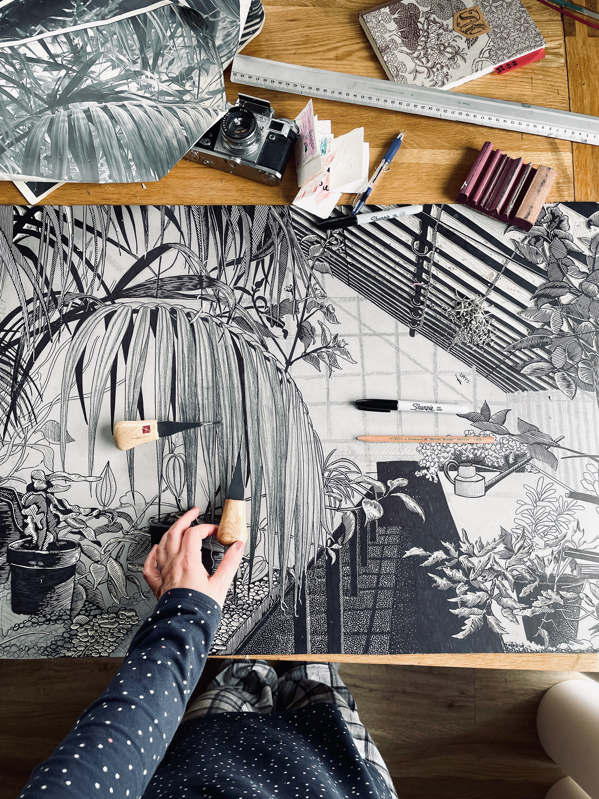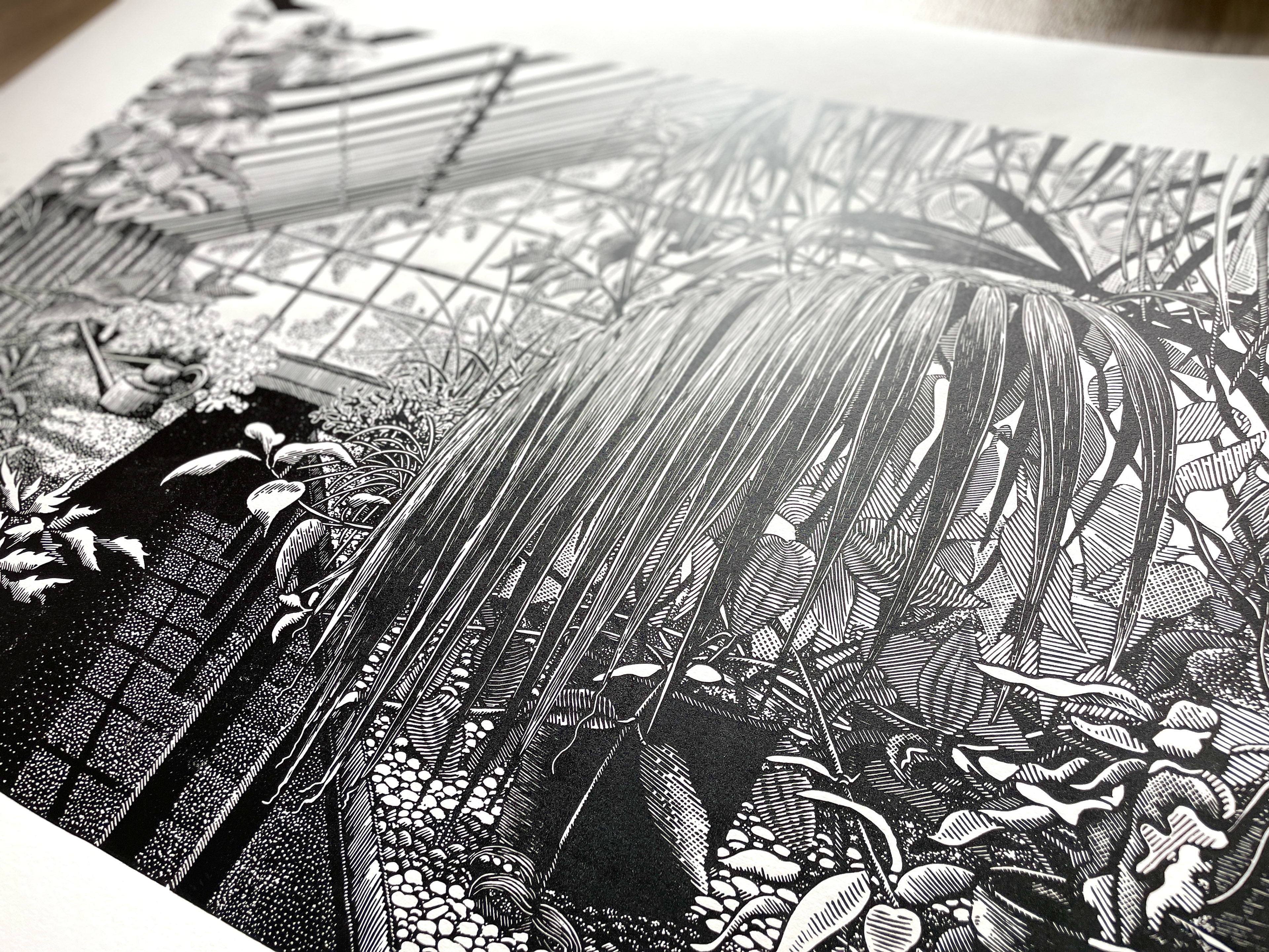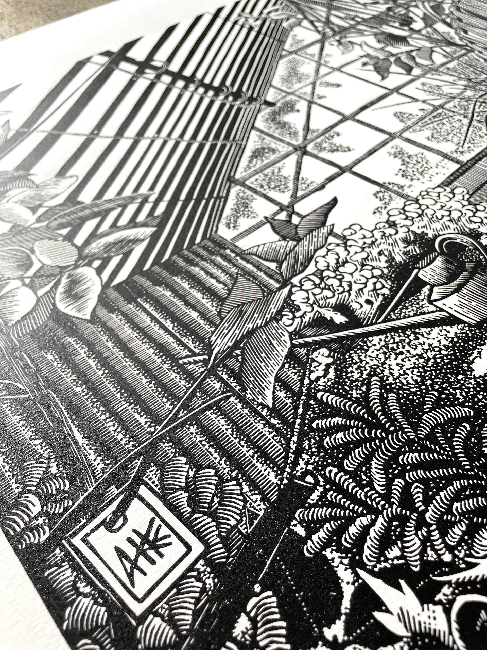 This linocut print titled “Green House” (100x70 cm), created by Aga Kubish in 2022, depicts a richly detailed greenhouse interior inspired by the historic Tyntesfield estate. The composition captures an immersive view of the space, brimming with lush plants, cascading foliage, and structural greenhouse elements like glass panes and iron supports. The perspective draws the viewer’s eye into the scene, evoking the serene and ordered chaos of a cultivated botanical space.