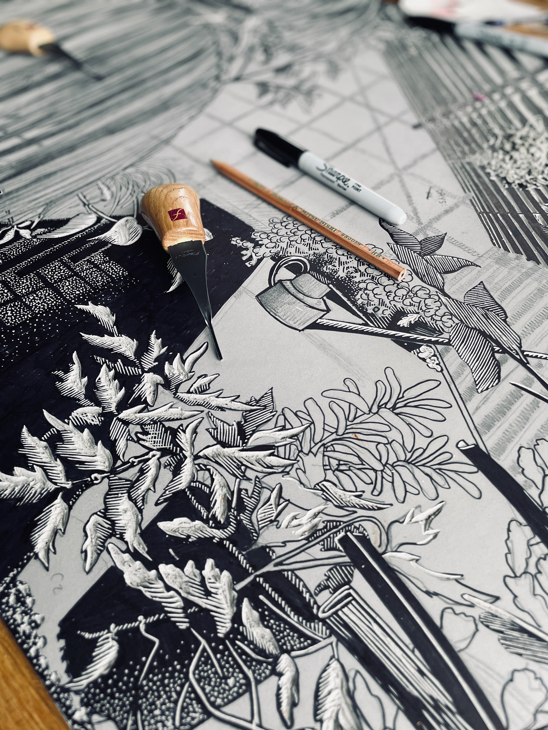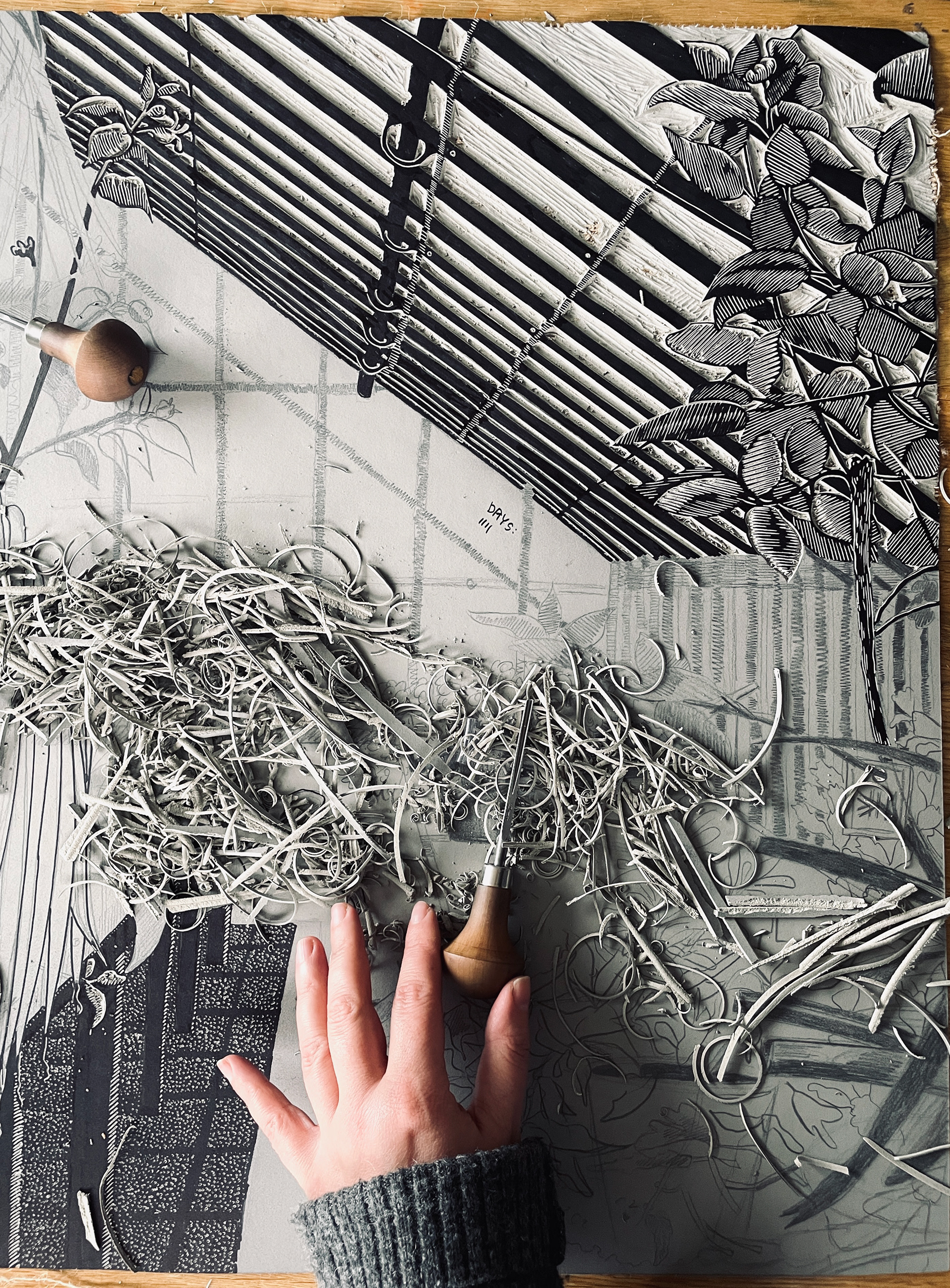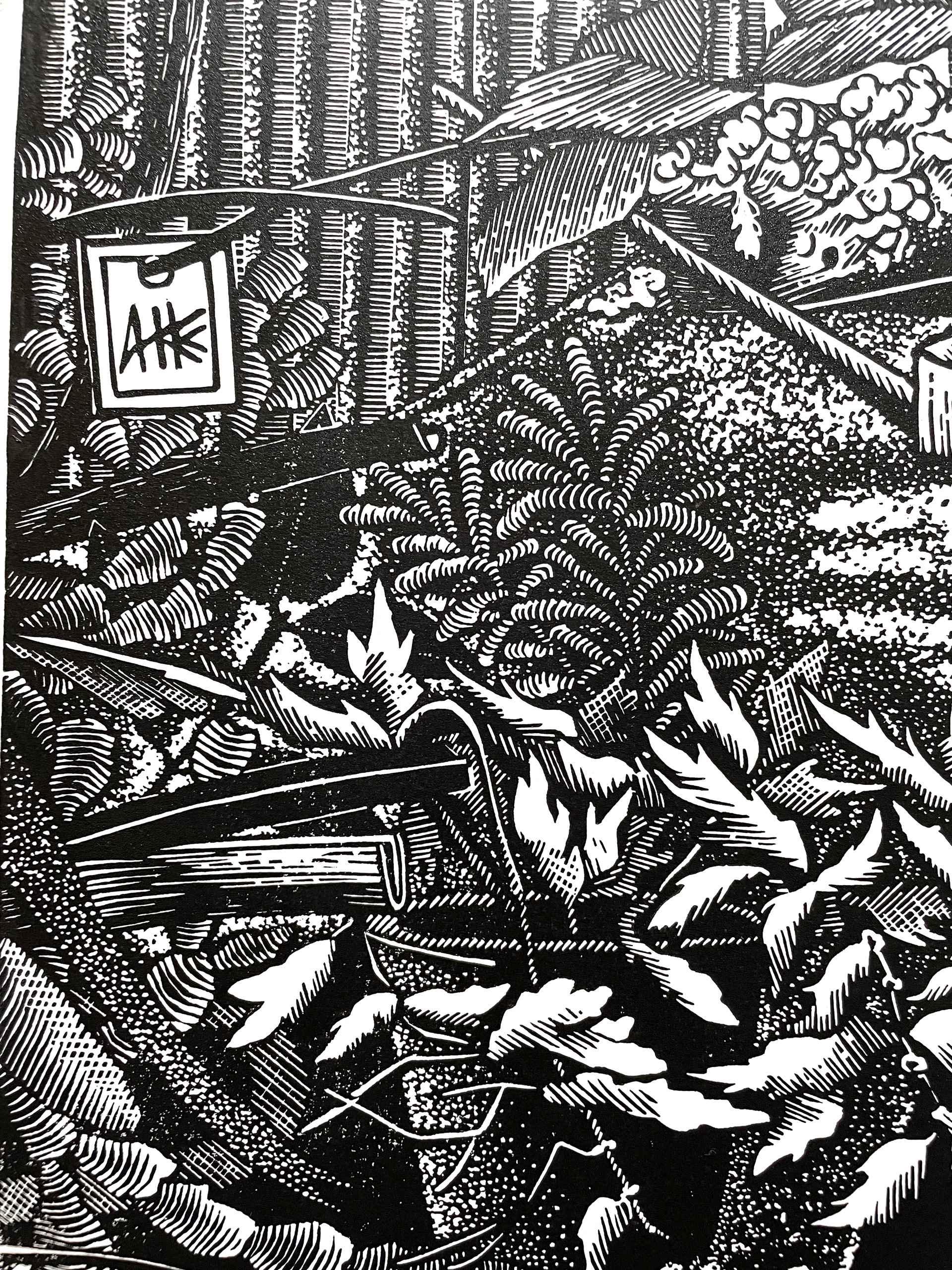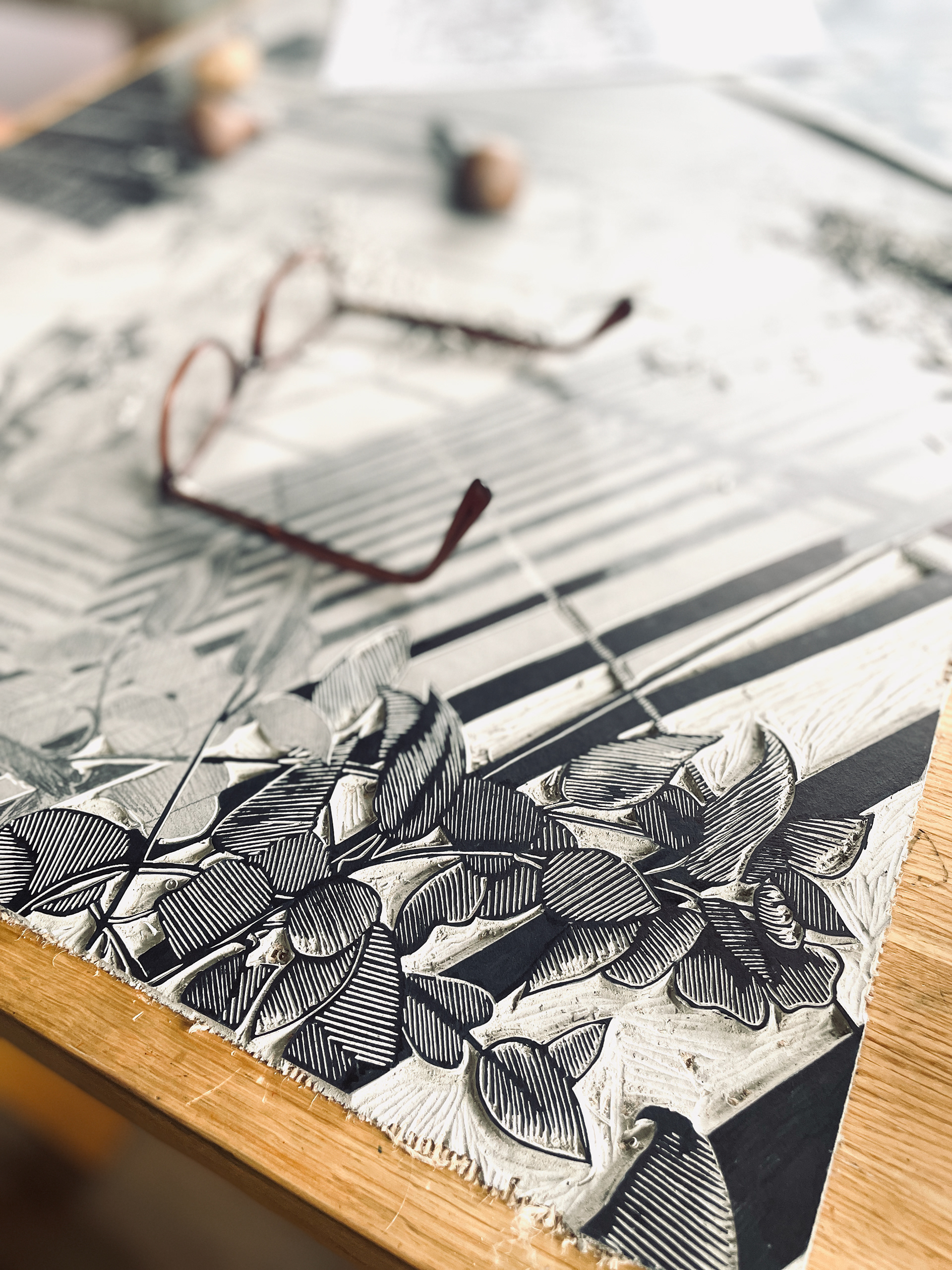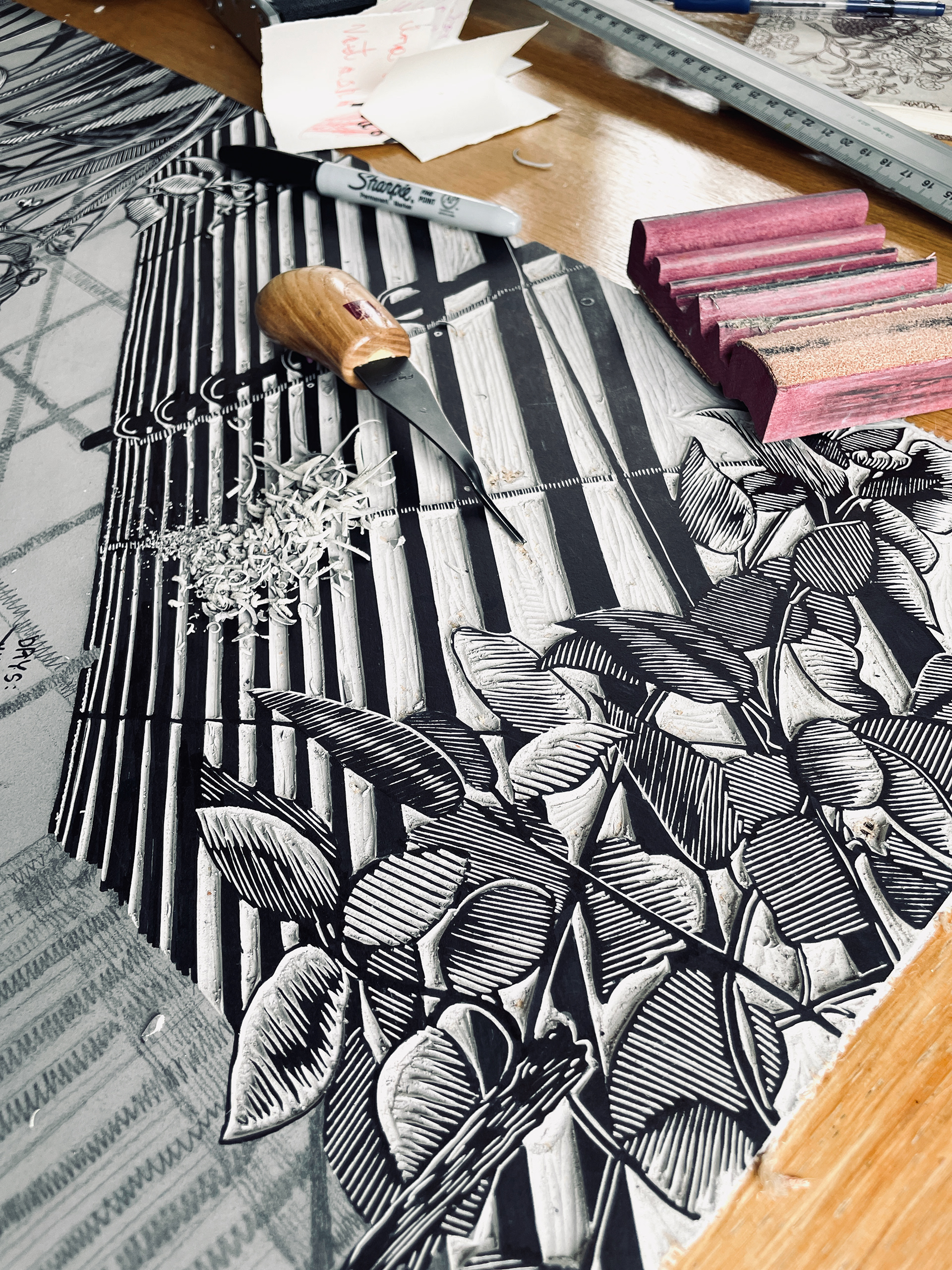 Overall, this linocut is a blend of technical skill, historical inspiration, and a contemporary appreciation for nature and craftsmanship. It celebrates both the natural and architectural worlds while paying homage to traditional printmaking techniques.