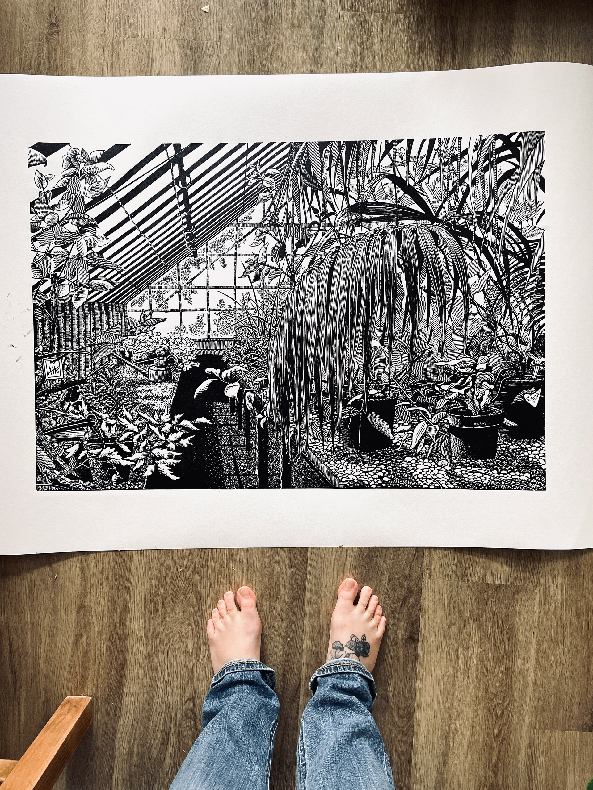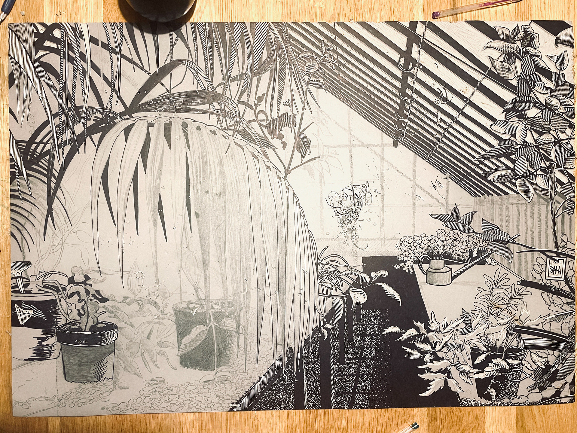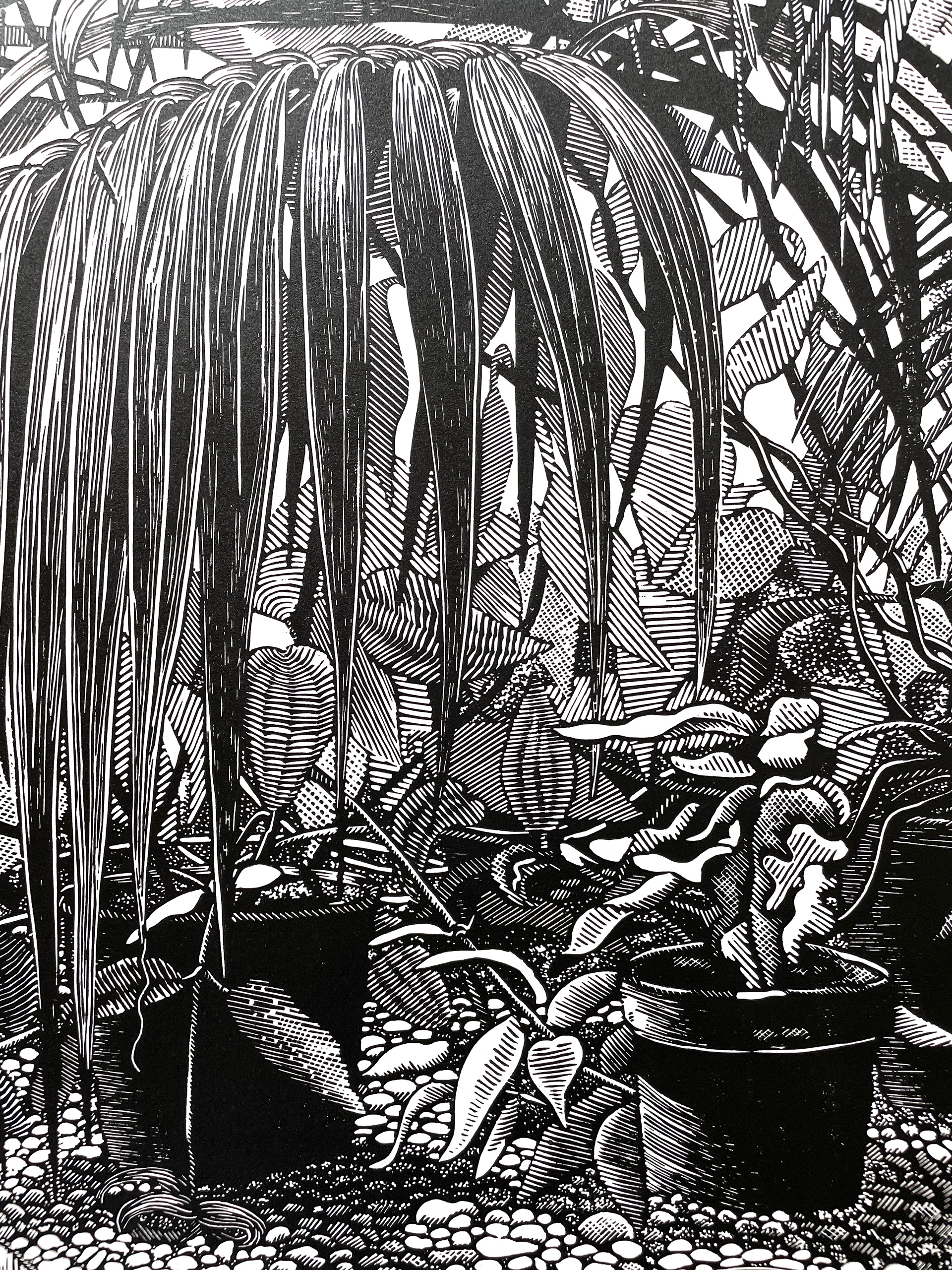 Kubish’s attention to botanical accuracy and the naturalistic rendering of plants places this work within the tradition of detailed botanical art, while the dramatic use of contrast nods to Expressionist printmaking. The delicate depiction of organic forms is juxtaposed with the rigid geometric structure of the greenhouse, creating a harmonious balance between nature and architecture.