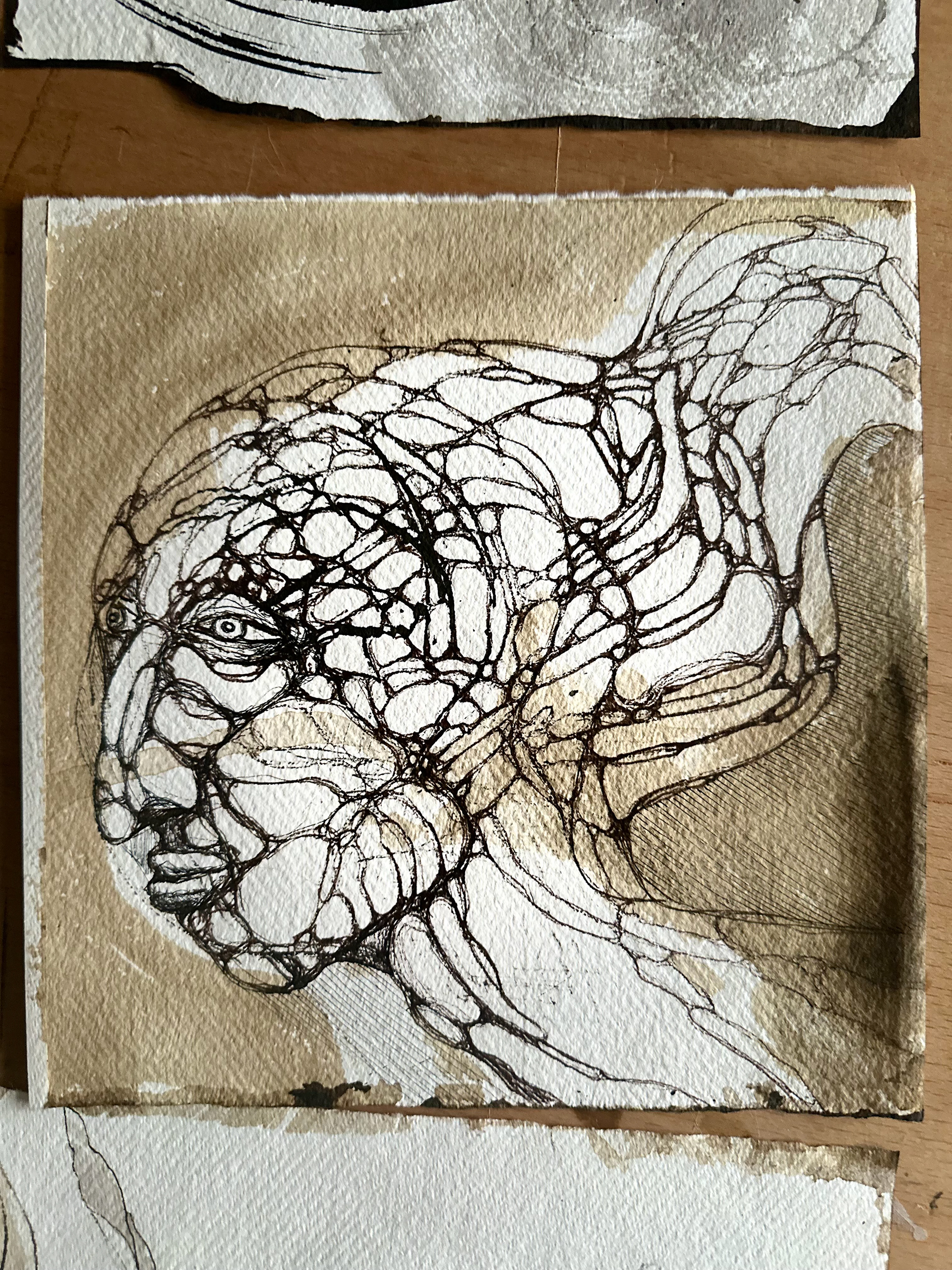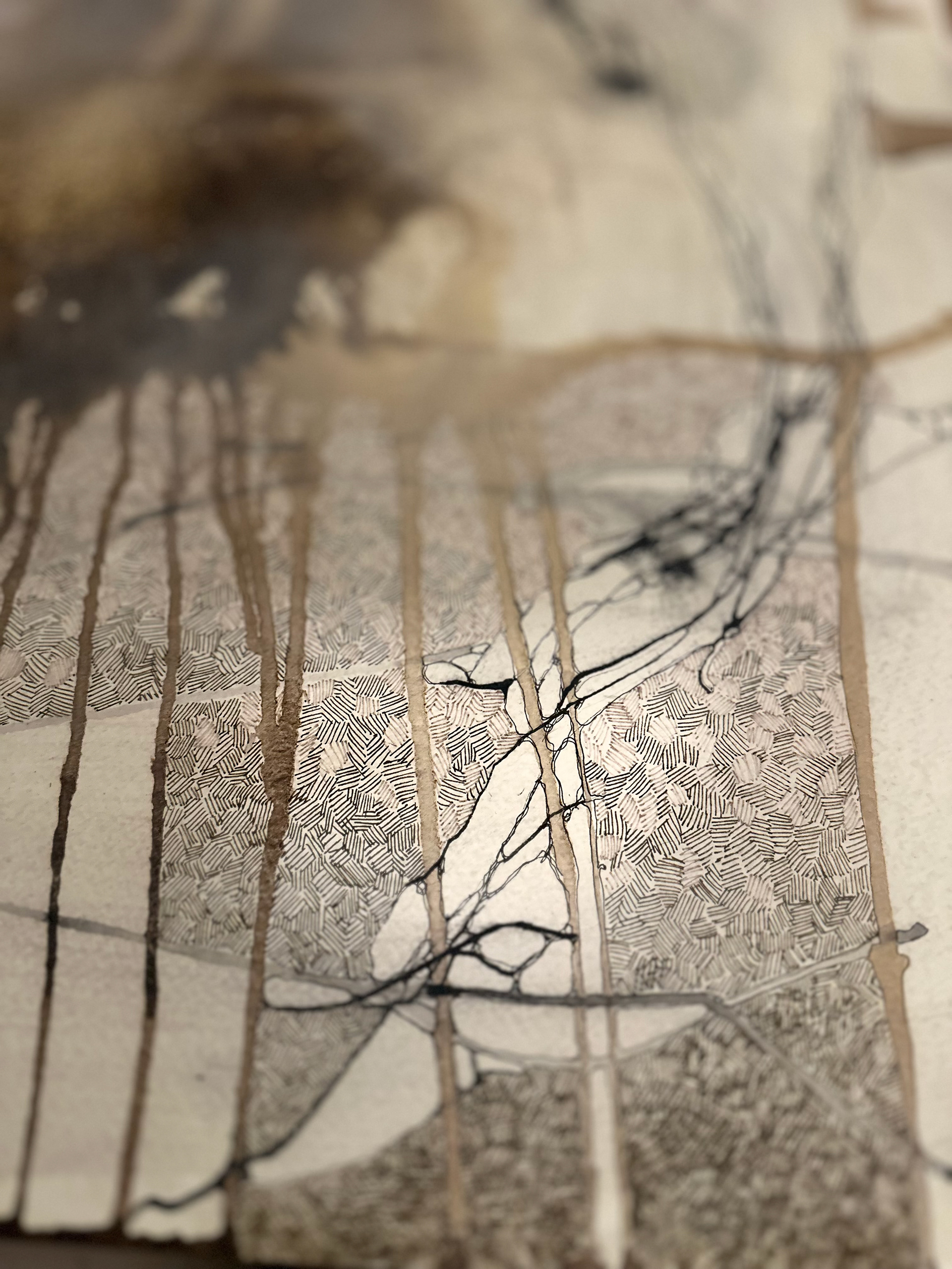 Each work develops through layered growth: from ink stains and fluid washes, through veils of softened light, to precise lines and structures reminiscent of nerves, fibres, roots, or landscape formations.