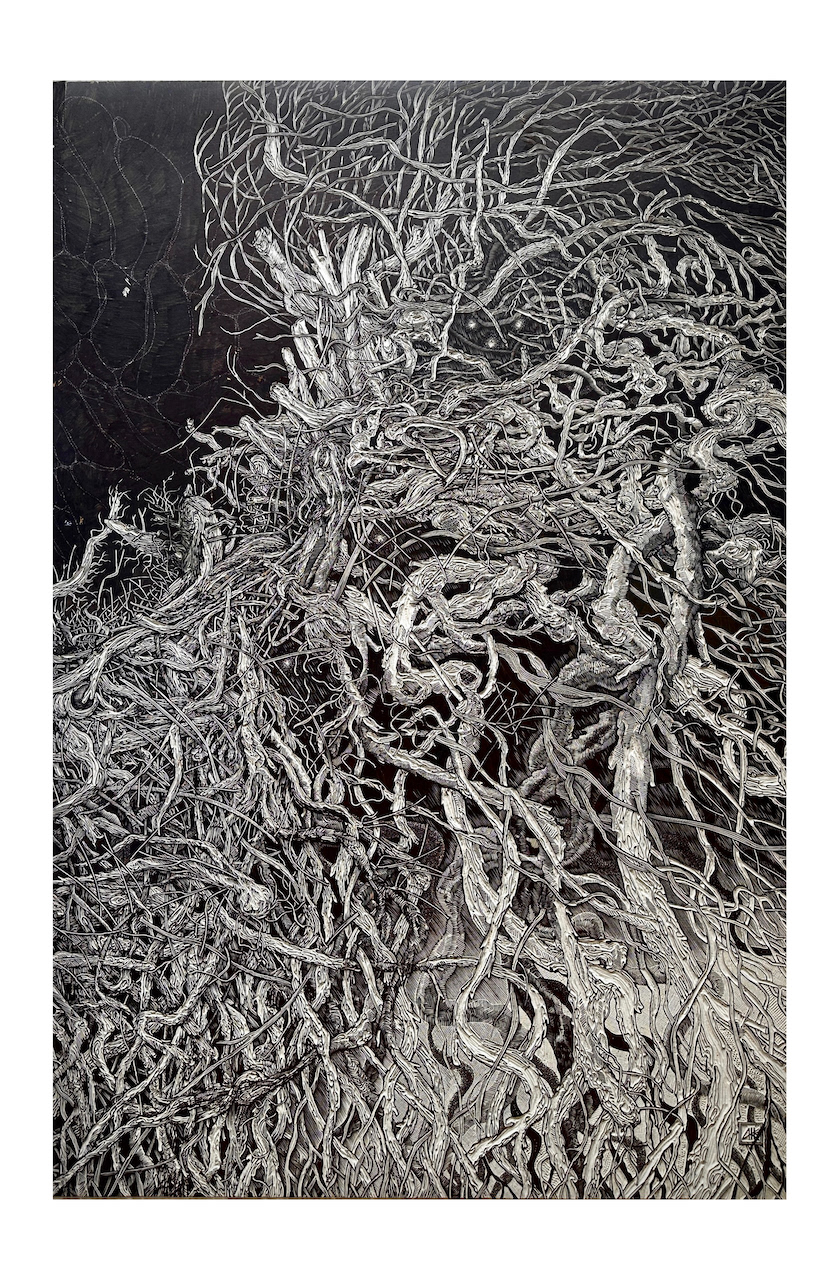 I work in layers — stains, washes, veils of white, carved marks, etched lines, drawn micro-patterns. Each layer is a negotiation between control and surrender, intention and accident. The resulting forms echo natural growth: branching, weaving, dispersing, gathering.