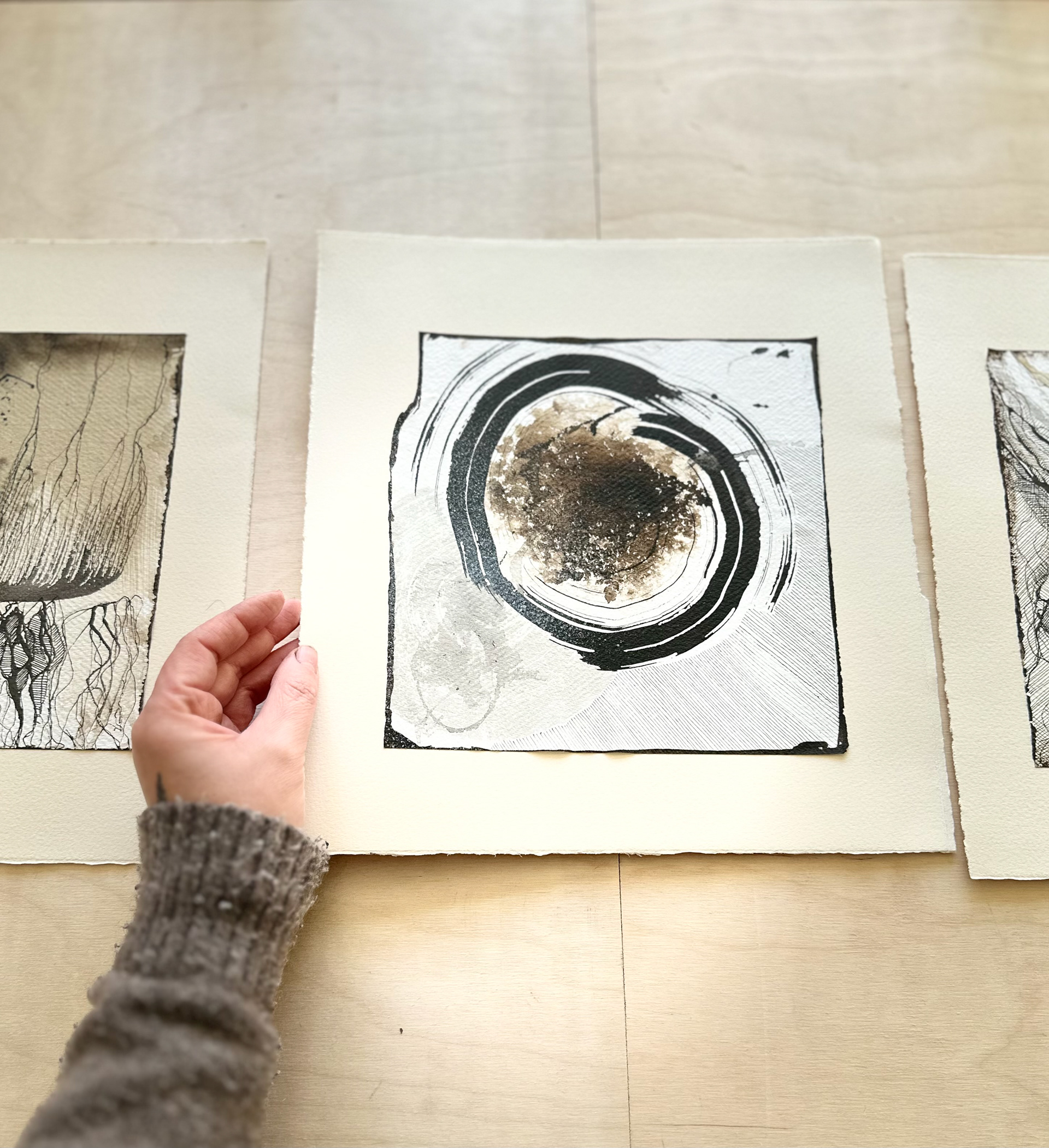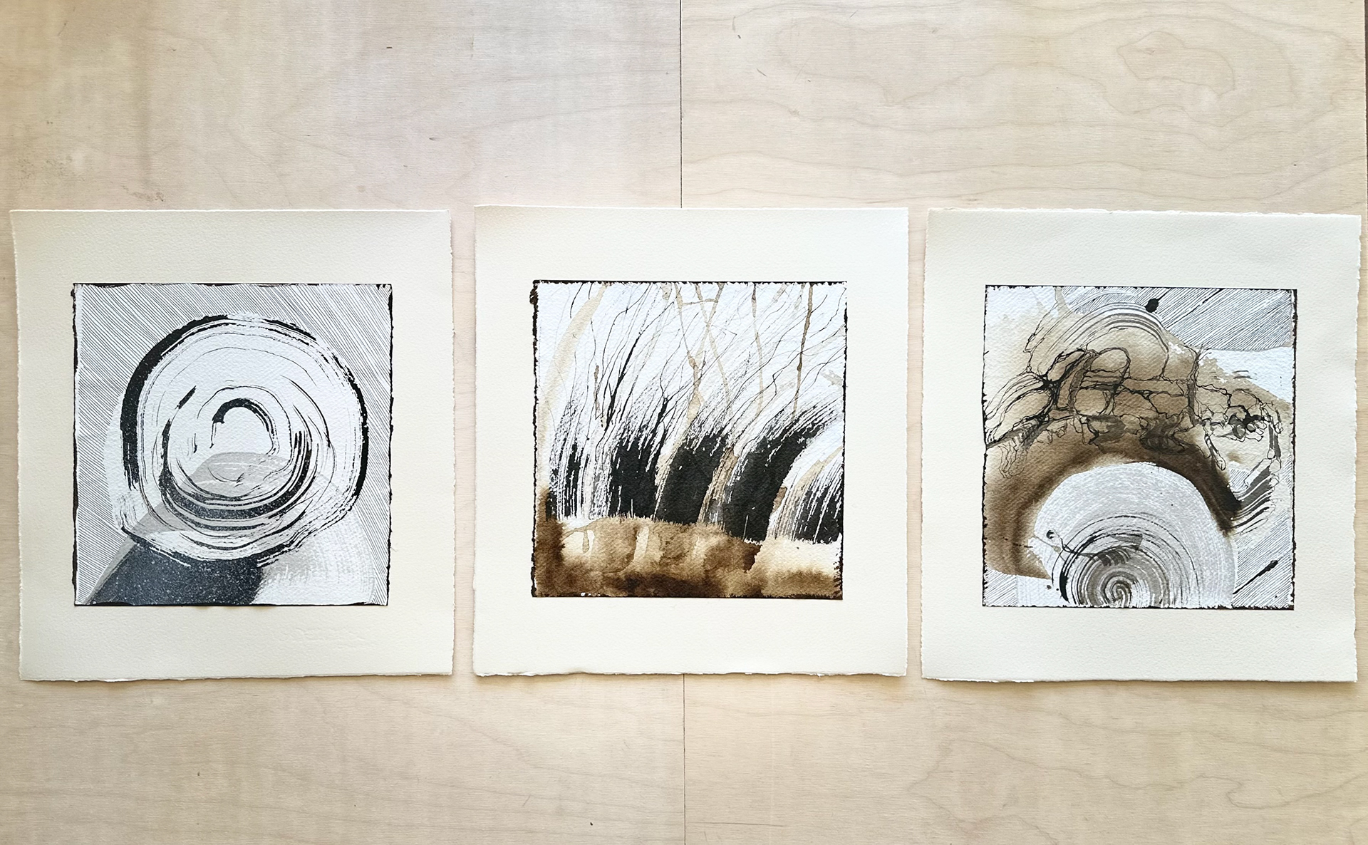 These three concepts weave together physical techniques of printmaking and drawing with an introspective observation of nature.