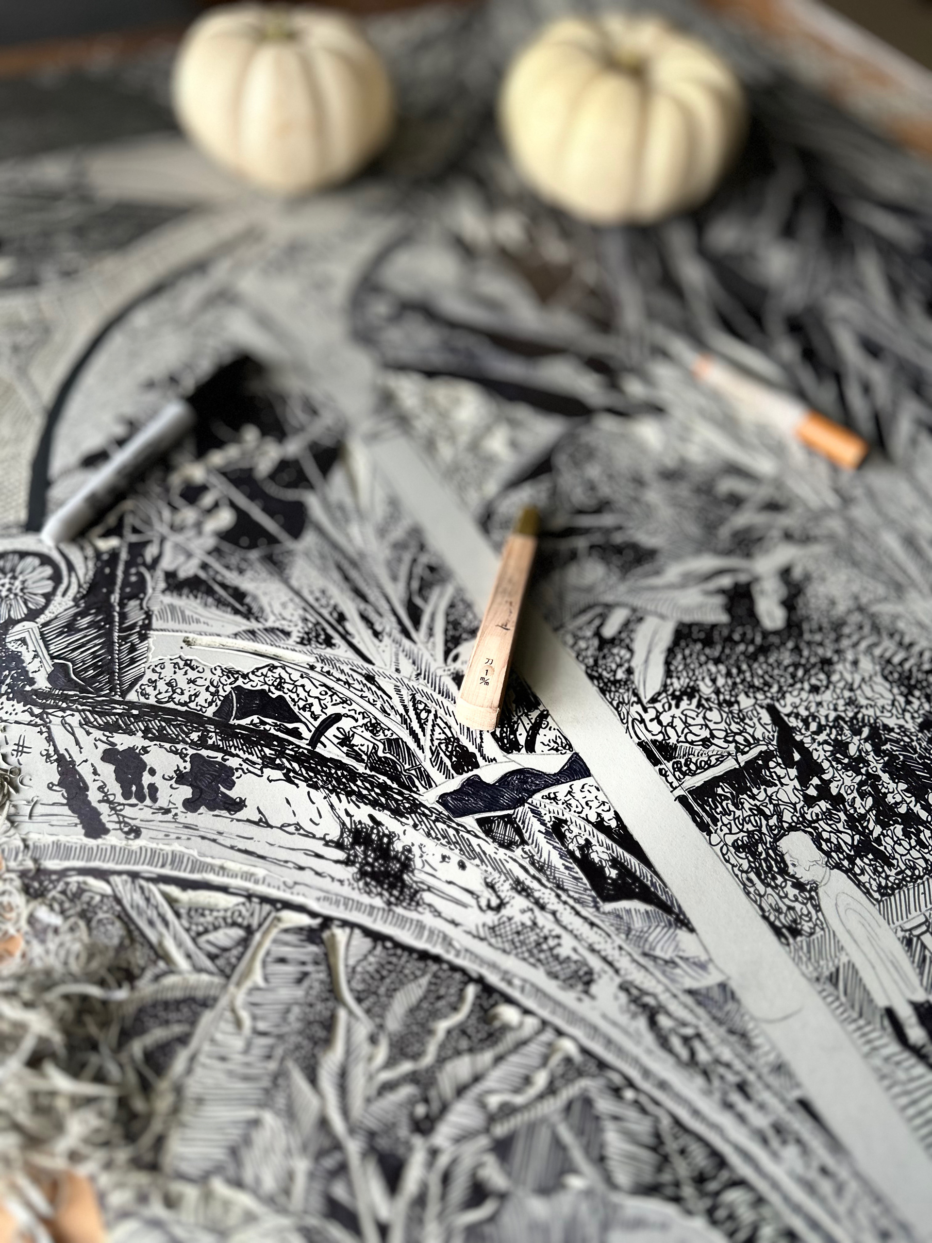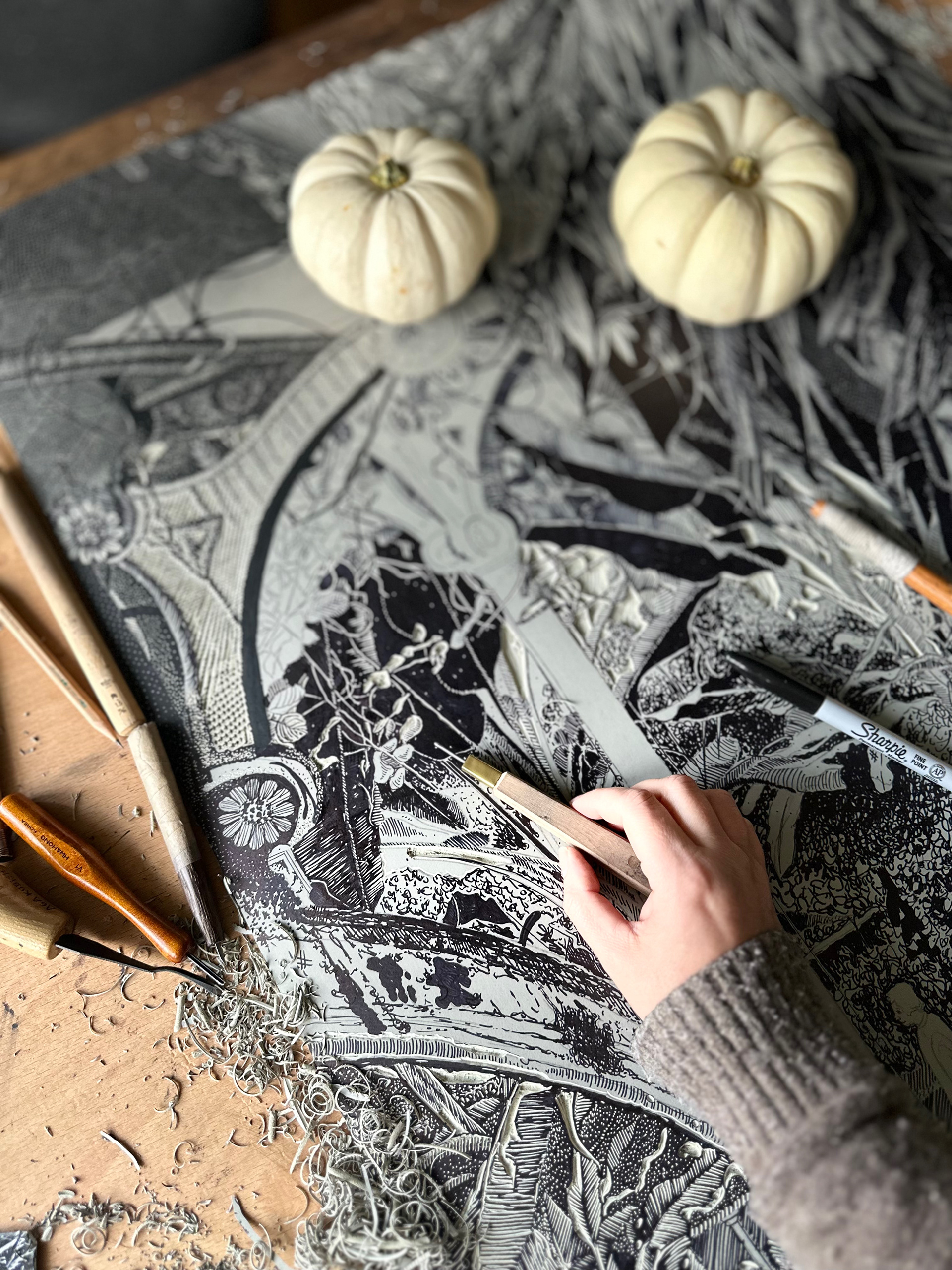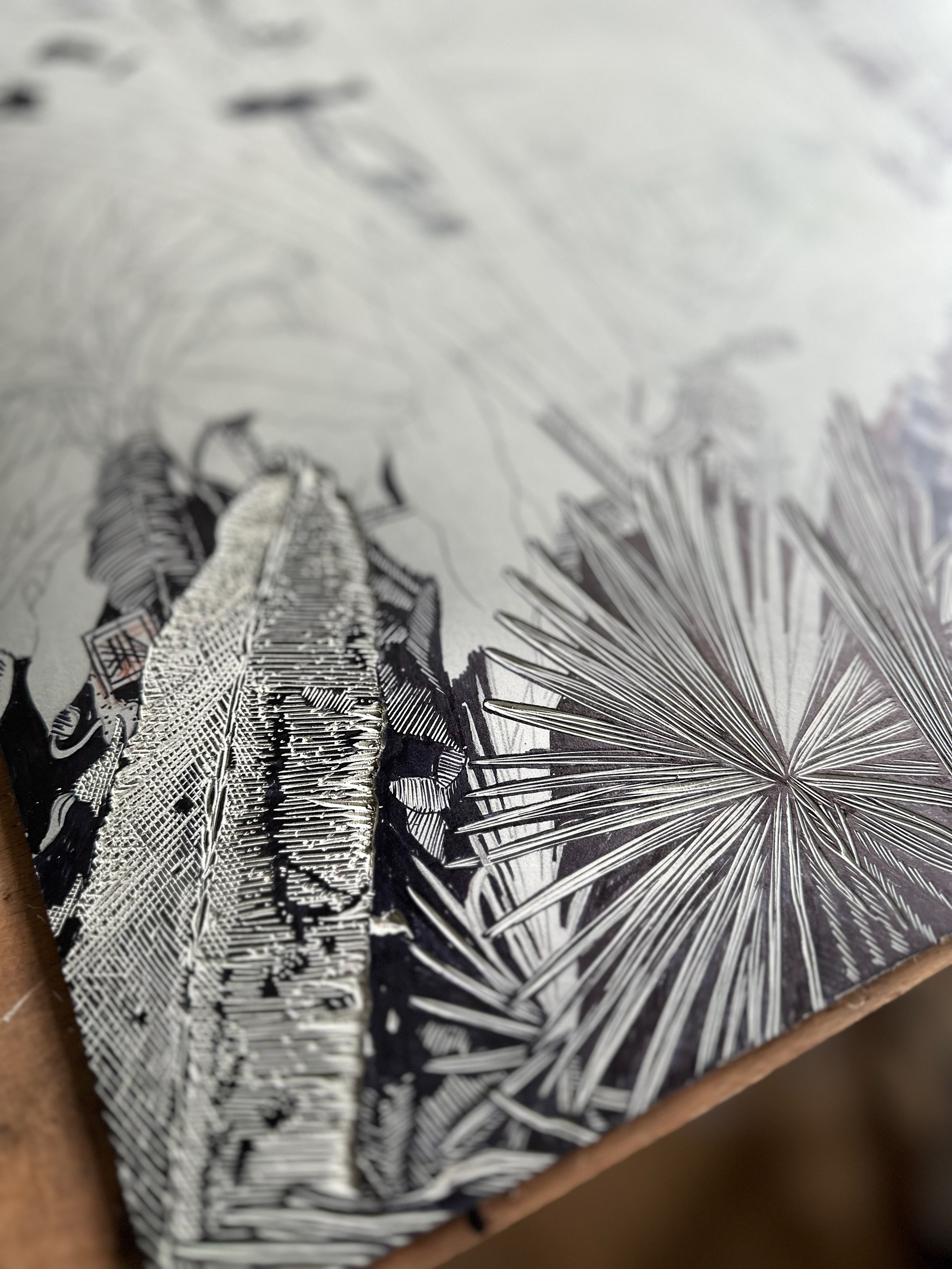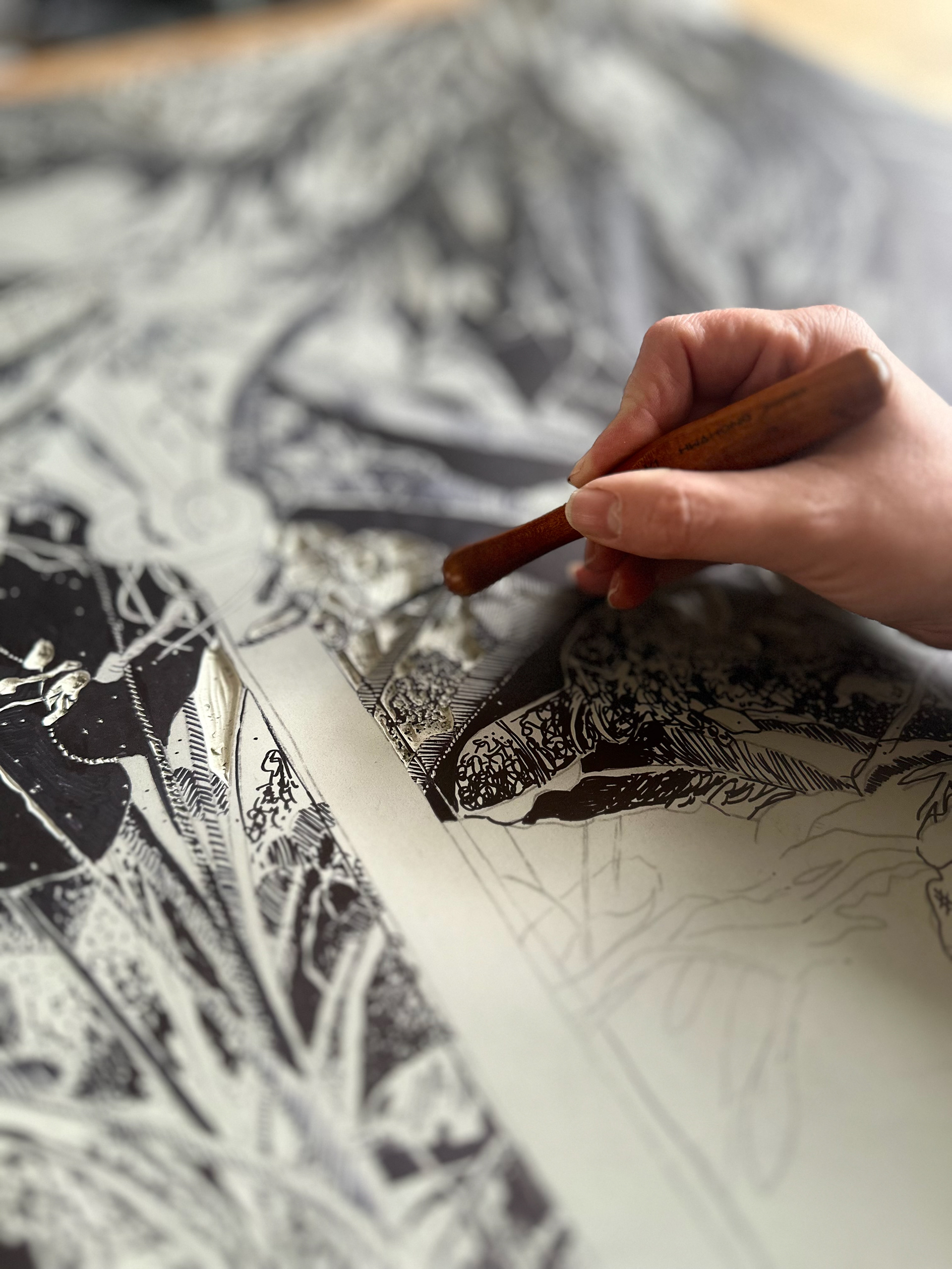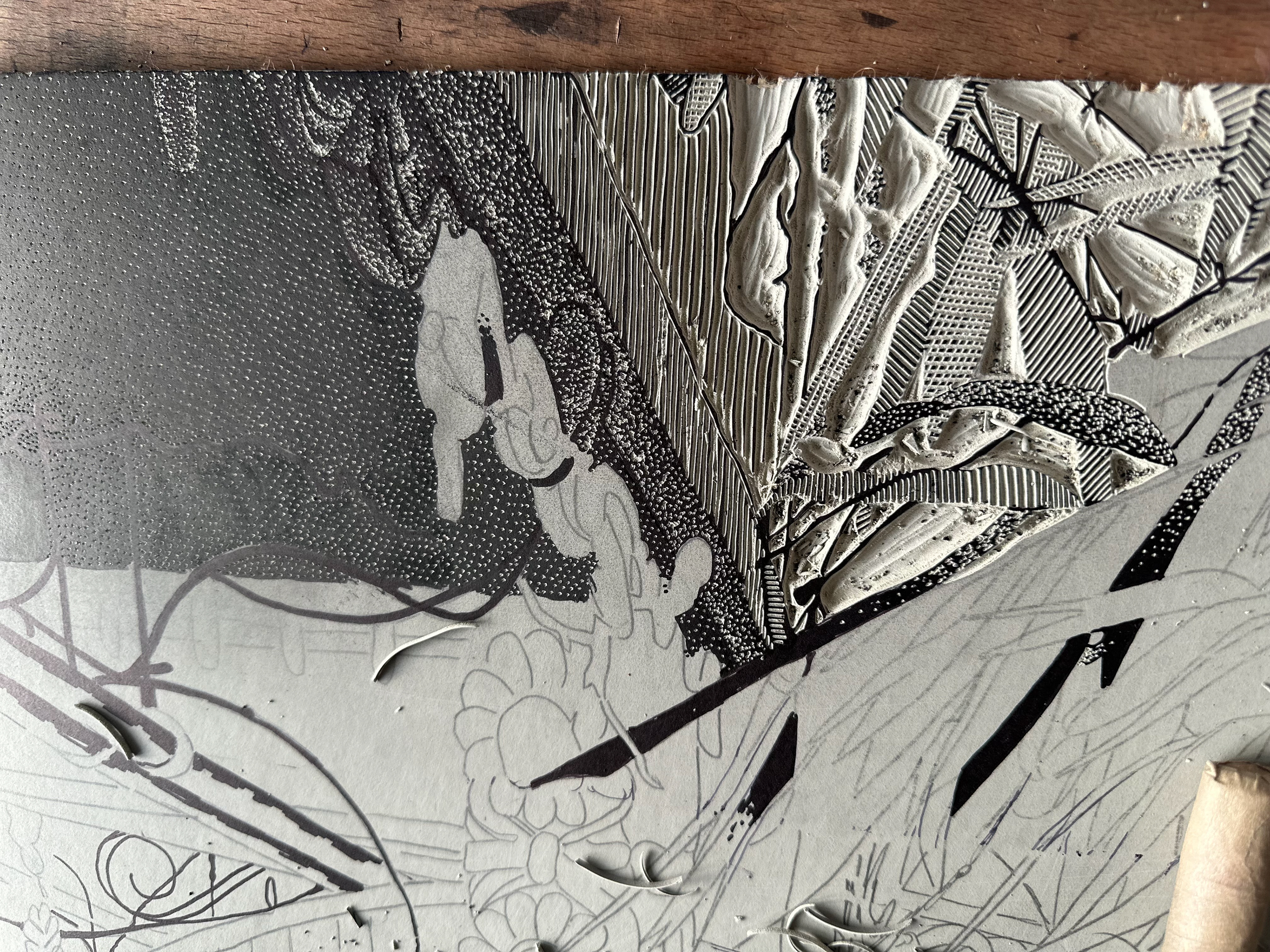 In this project, I decided to focus even more on textures and patterns, which make the sense of shading so difficult to achieve in lino printing.