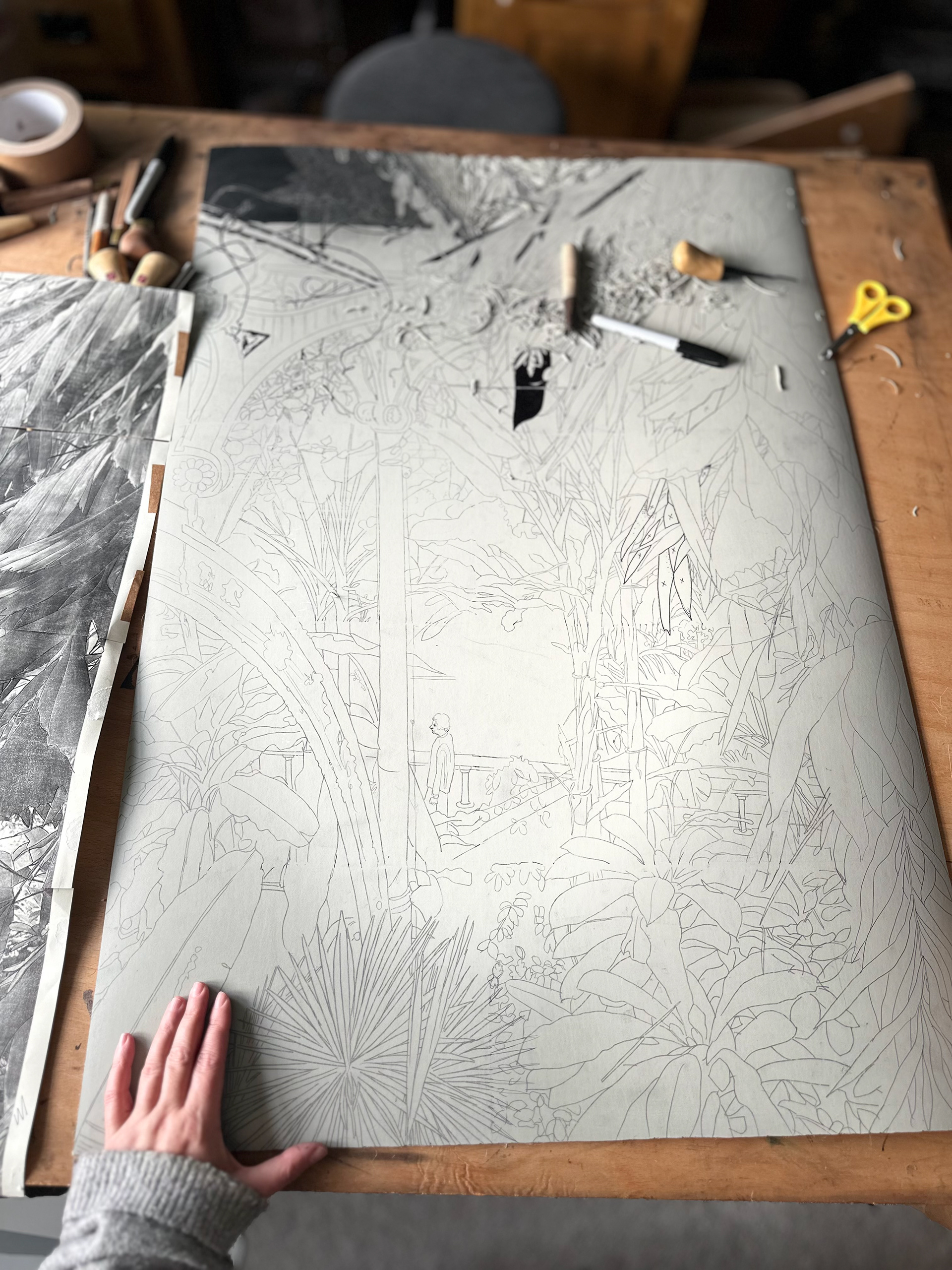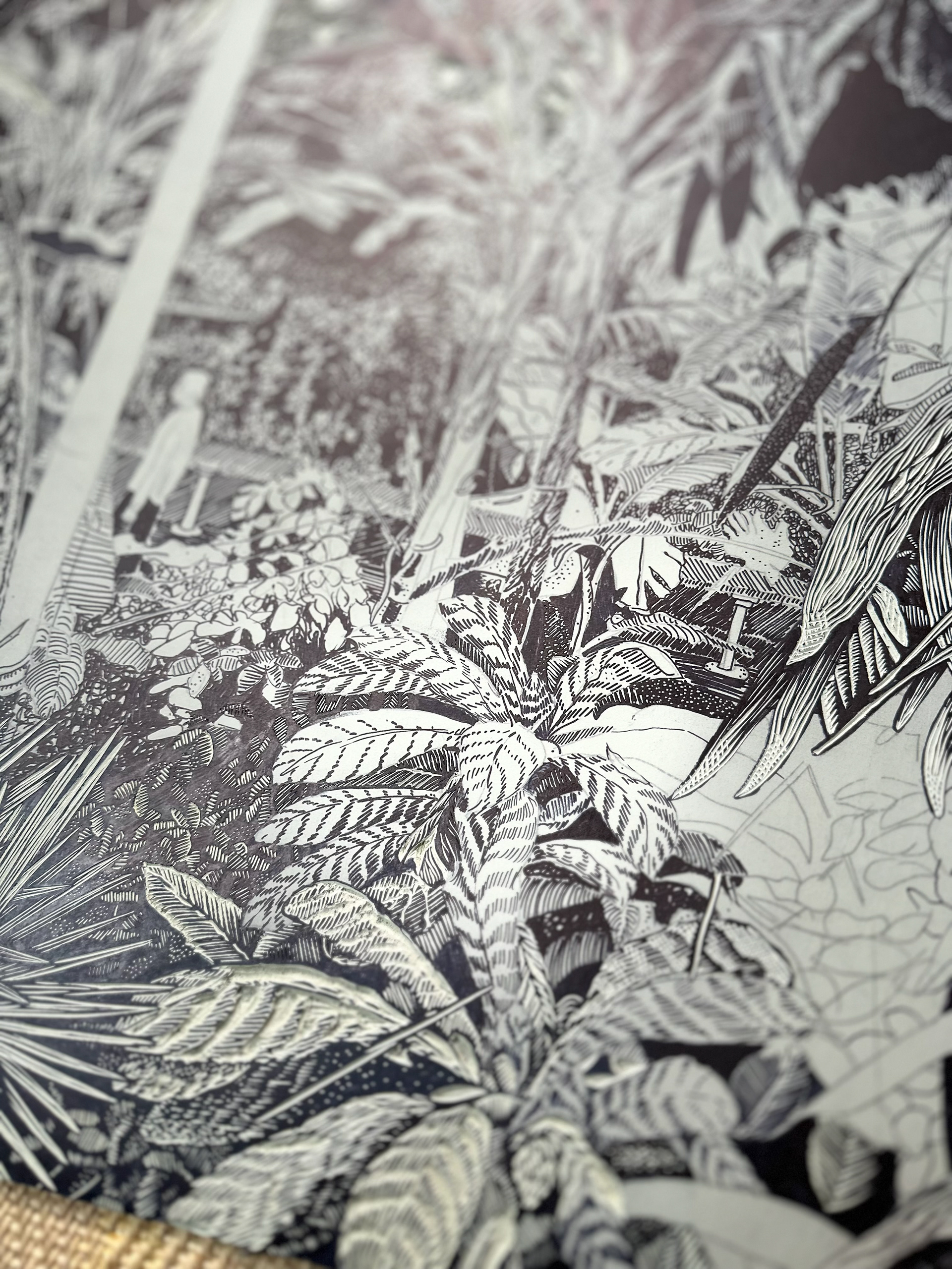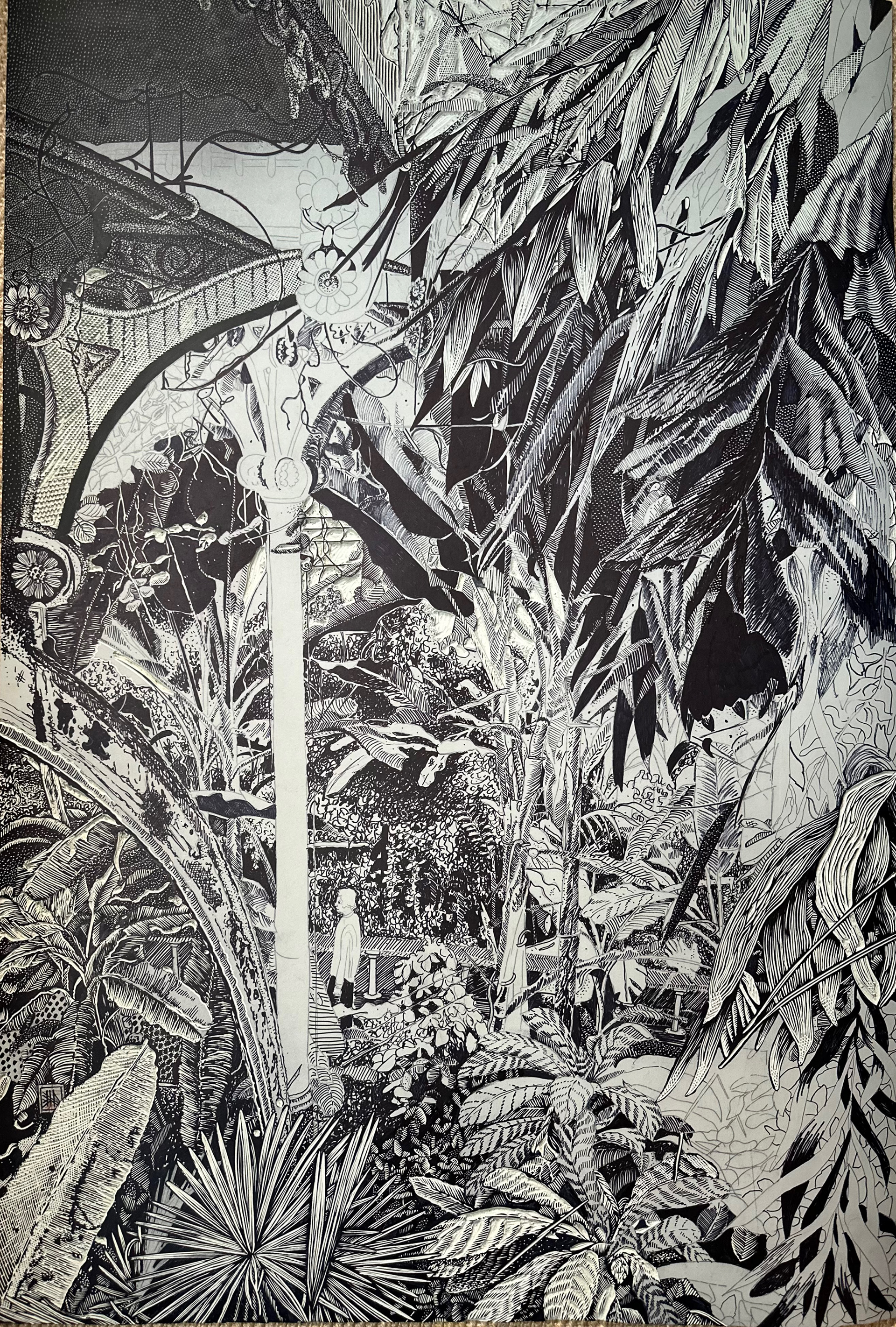 This work continues my exploration of the relationship between organic growth and human-made structure. It draws on traditions of botanical illustration and architectural printmaking, yet departs from them by rejecting precision in favour of texture and flow. The absence of contour lines recalls early expressionist woodcuts, where emotional rhythm replaced technical control. The Palm House — a Victorian symbol of order and collection — becomes here an arena of coexistence, echoing broader shifts in art history from domination of nature to collaboration with it.