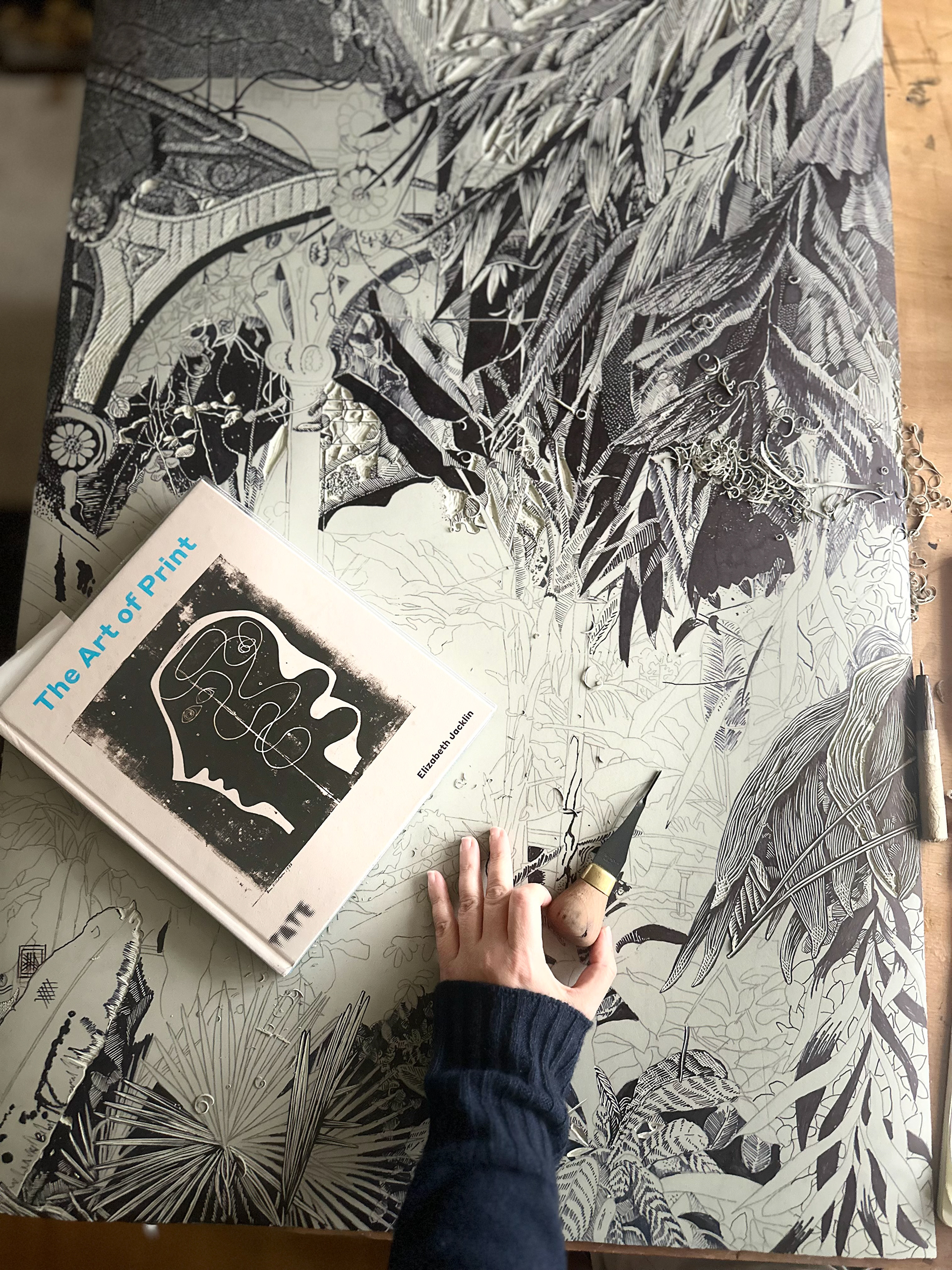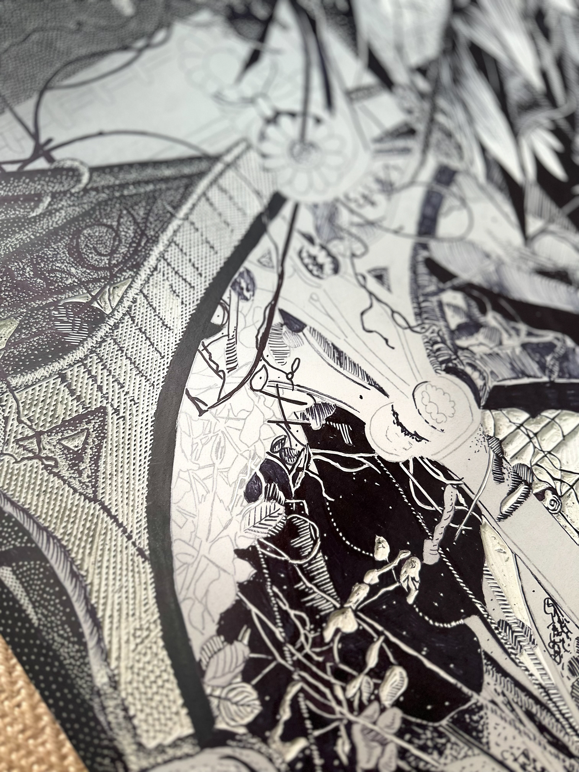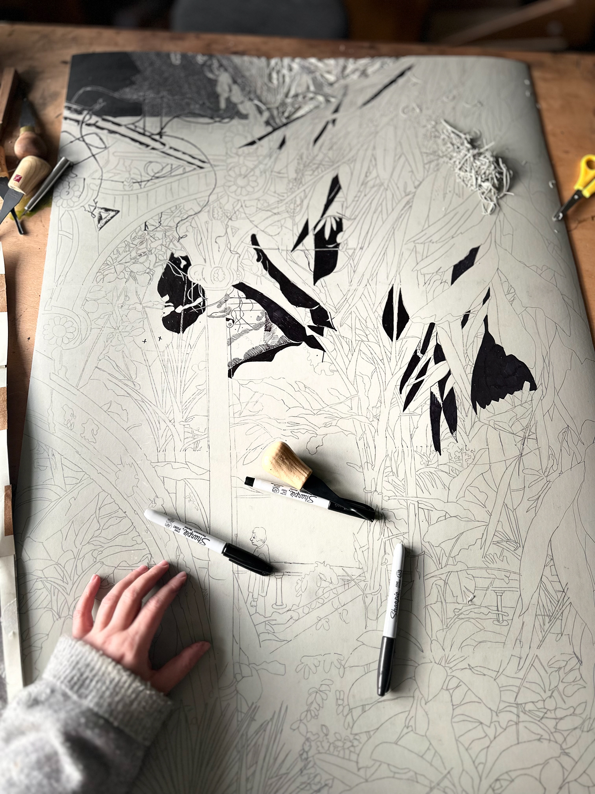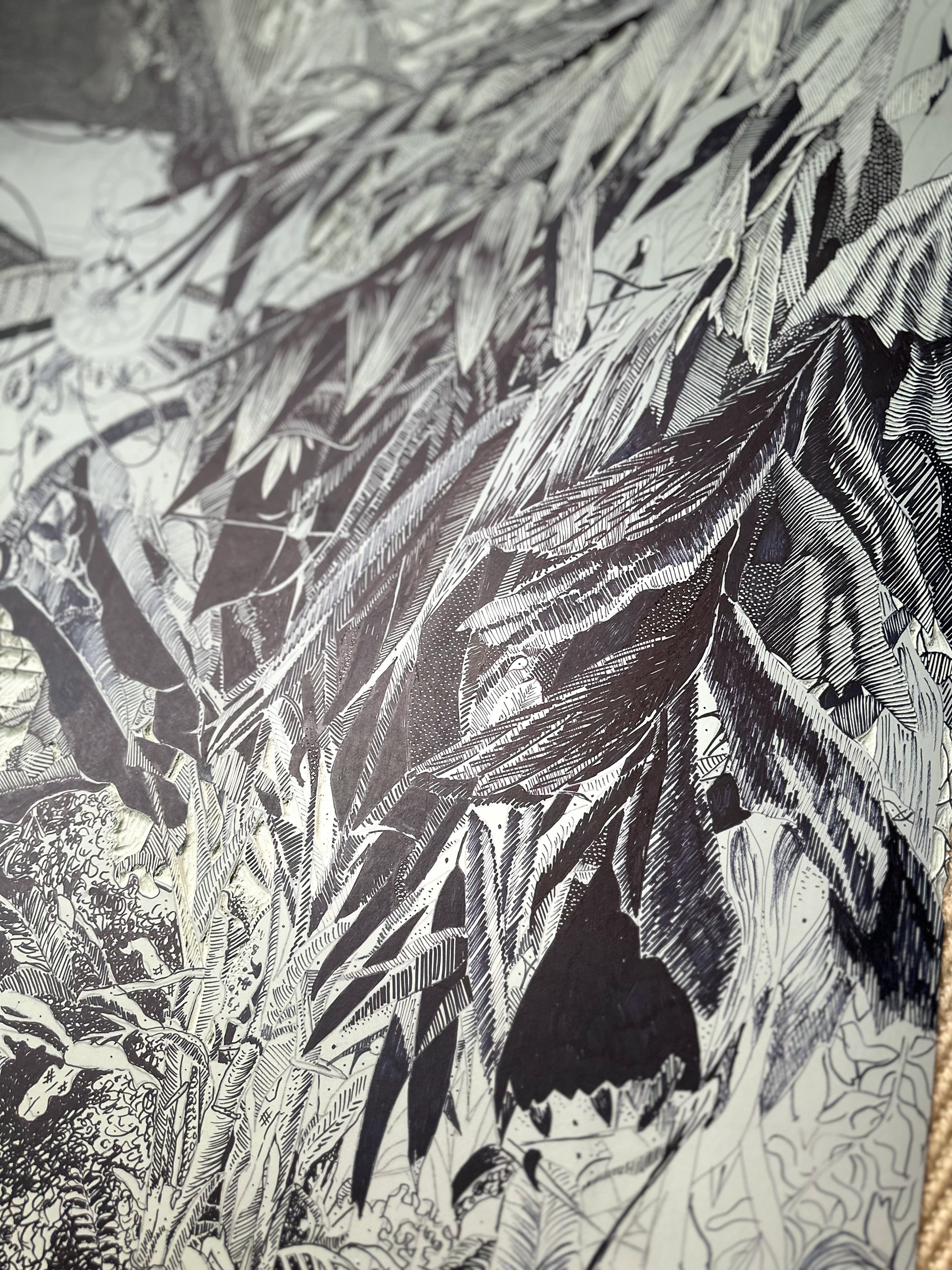 This work continues my exploration of the relationship between organic growth and human-made structure. It draws on traditions of botanical illustration and architectural printmaking, yet departs from them by rejecting precision in favour of texture and flow. The absence of contour lines recalls early expressionist woodcuts, where emotional rhythm replaced technical control. The Palm House — a Victorian symbol of order and collection — becomes here an arena of coexistence, echoing broader shifts in art history from domination of nature to collaboration with it.