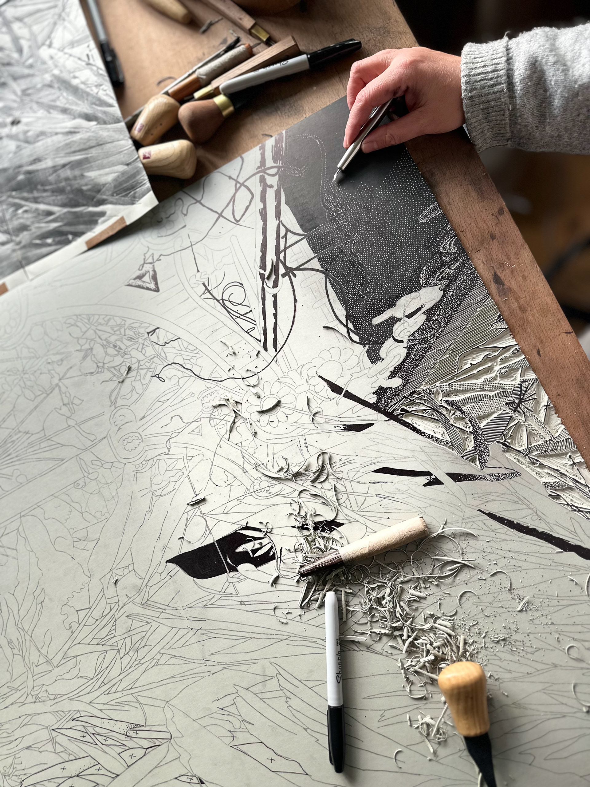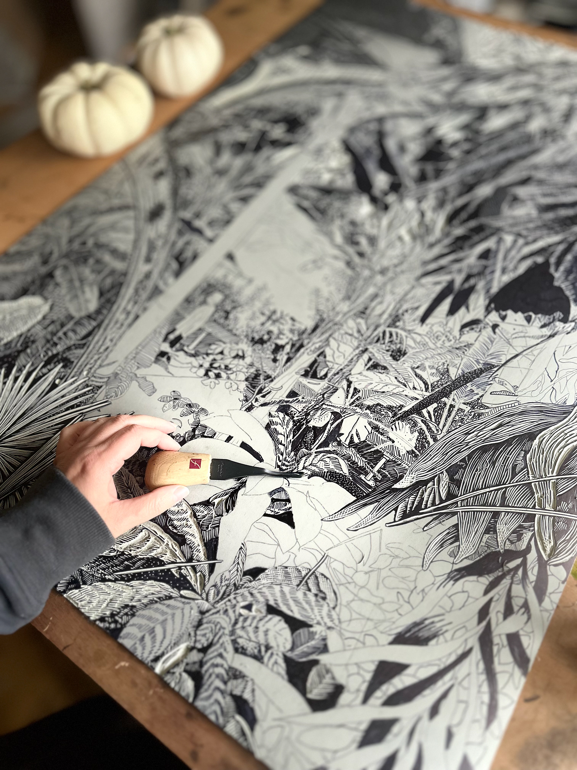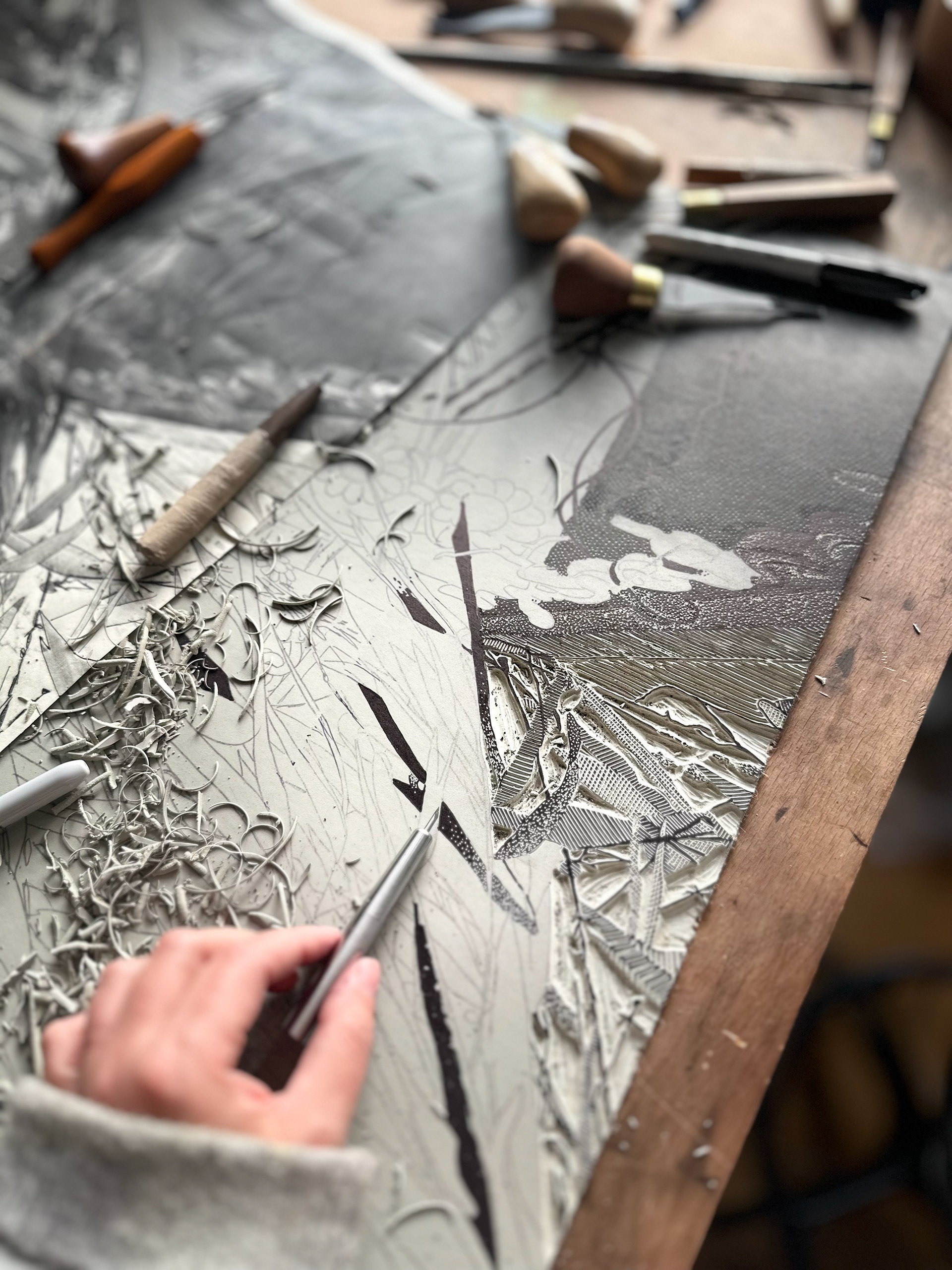 この作品「Sanctuary(聖域)」は、自然と建築のあいだにある静かな調和を探るリノカットです。