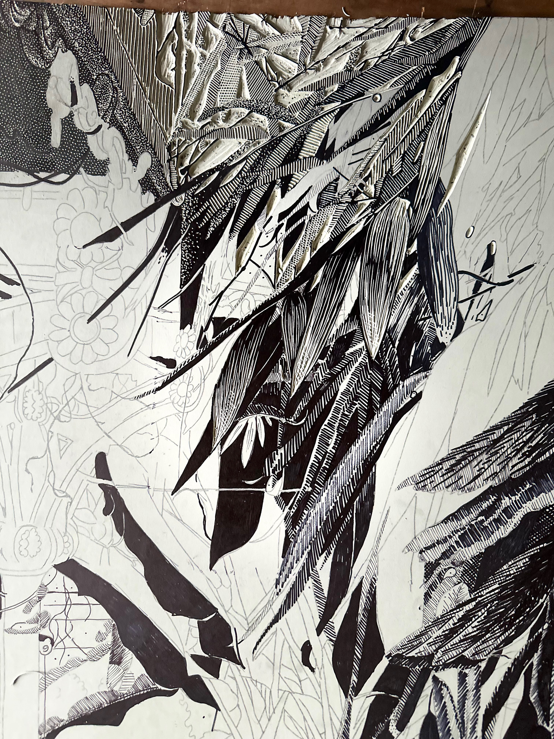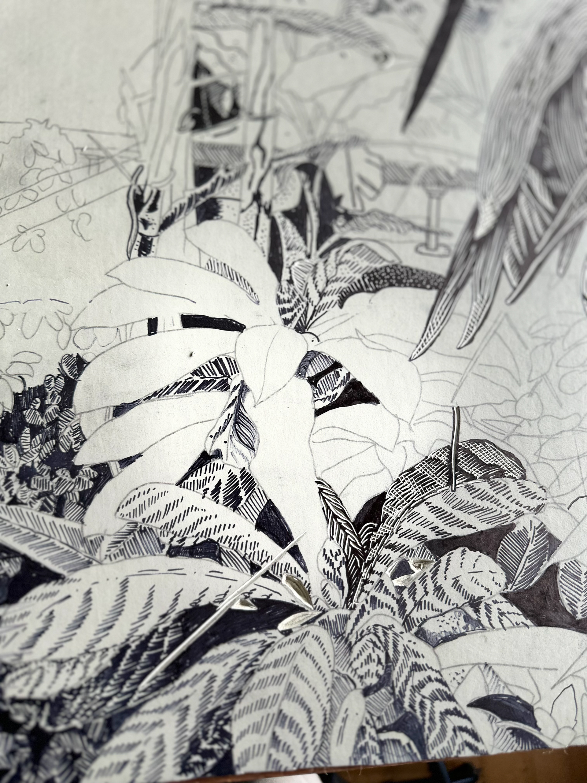 The idea of showing the Palm House in a more chaotic, organic way connects with the thought of leaving the contour line and letting the textures touch each other. Through that choice, I could get closer to myself in some sense. Dropping the boundaries represented by strong outlines gave me more freedom in creation, but also opened new challenges. There was a risk of losing the contrast between lights, mid-tones, and dark areas.