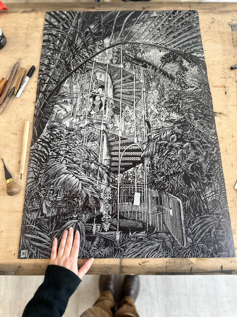 The piece showcases masterful linocut craftsmanship. Kubish’s use of detailed carving captures the interplay of nature and man-made structures, emphasizing the tension between order and the wild. The print is reminiscent of 19th-century botanical engravings and Art Nouveau influences, blending decorative art with an appreciation for the natural world.
